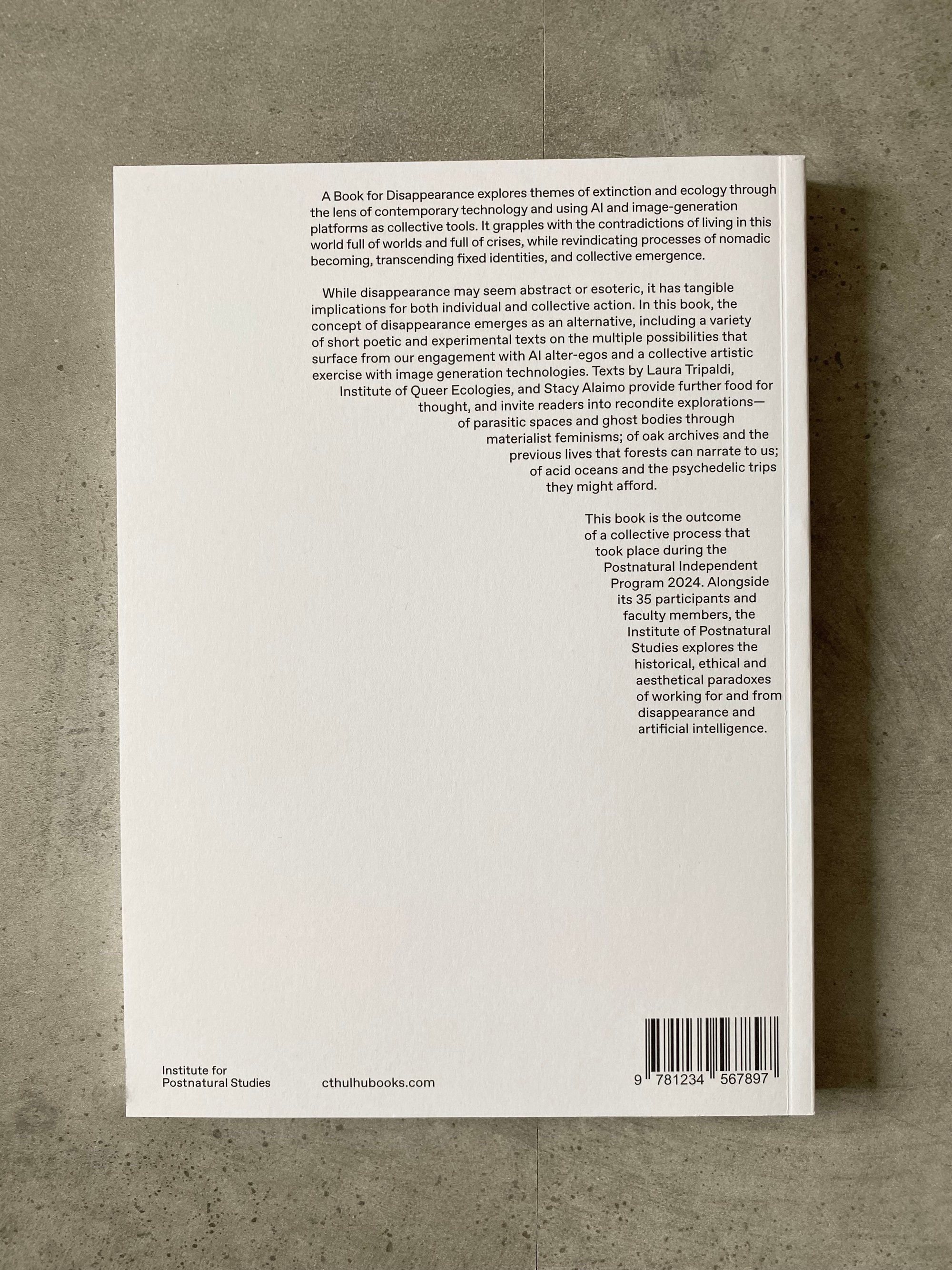 A Book for Disappearance explores themes of extinction and ecology through the lens of contemporary technology and using AI and image-generation platforms as collective tools. It grapples with the contradictions of living in this world full of worlds and full of crises, while revindicating processes of nomadic becoming, transcending fixed identities, and collective emergence. Texts by Laura Tripaldi, Institute of Queer Ecologies, and Stacy Alaimo provide further food for thought, and invite readers into recondite explorations—of parasitic spaces and ghost bodies through materialist feminisms; of oak archives and the previous lives that forests can narrate to us; of acid oceans and the psychedelic trips they might afford.