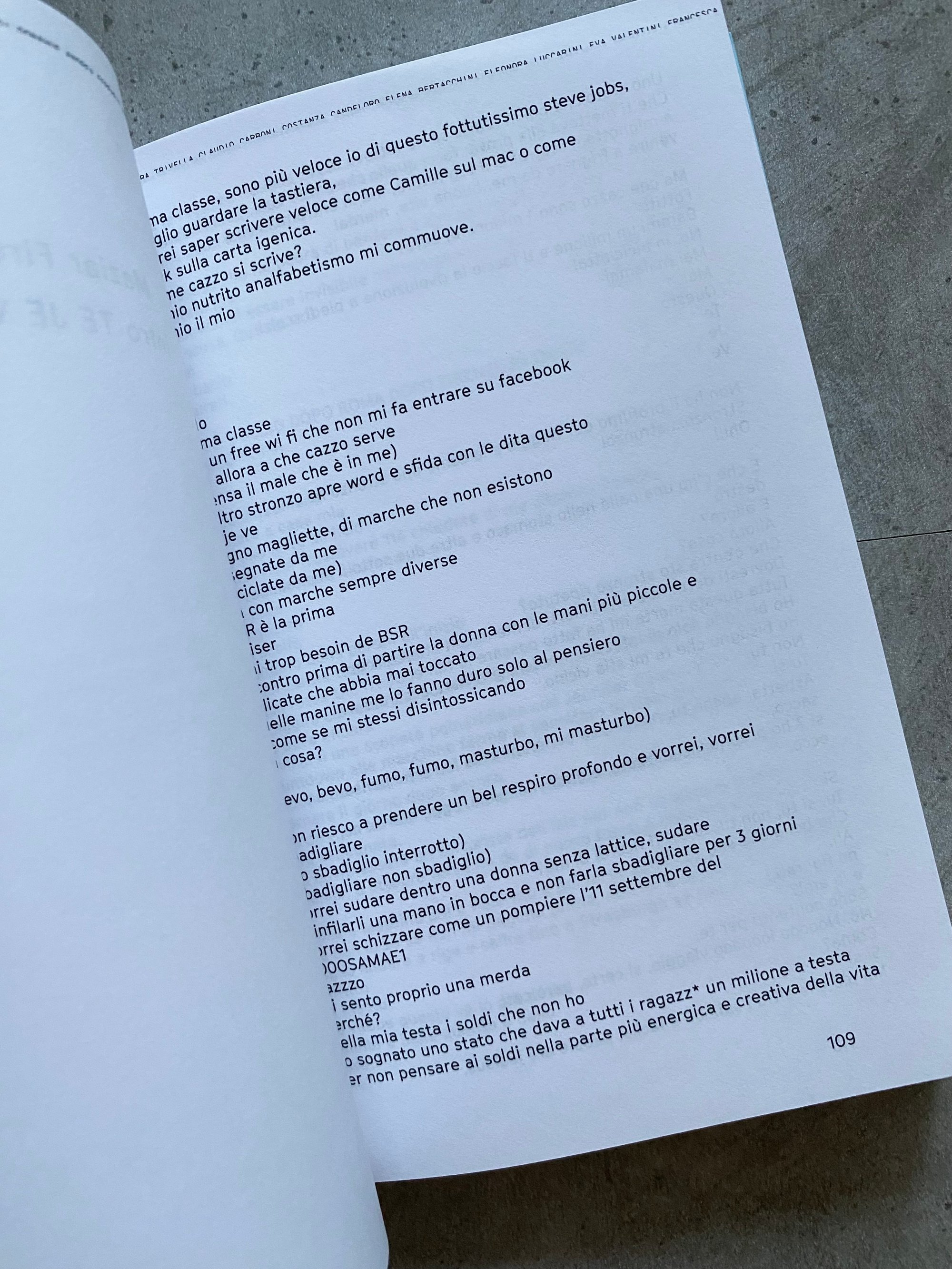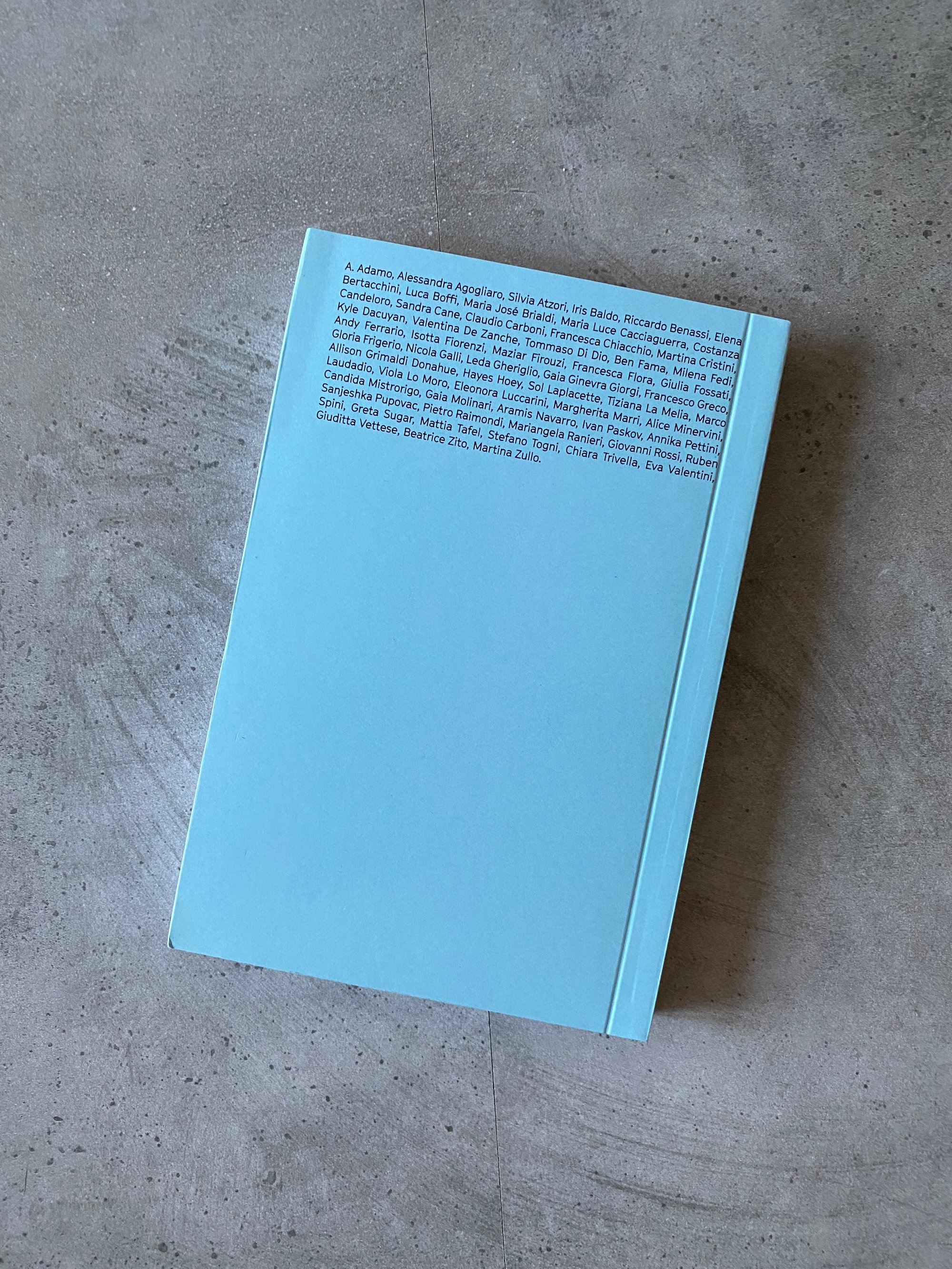 Texts by A. Adamo, Alessandra Agogliaro, Silvia Atzori, Iris Baldo, Riccardo Benassi, Elena Bertacchini, Luca Boffi, Maria Jose Brialdi, Maria Luce Cacciaguerra, Costanza Candeloro, Sandra Cane, Claudio Carboni, Francesca Chiacchio, Martina Cristini, Kyle Dacuyan, Valentina De Zanche, Tommaso Di Dio, Ben Fama, Milena Fedi, Andy Ferrario, Isotta Fiorenzi, Maziar Firouzi, Francesca Flora, Giulia Fossati, Gloria Frigerio, Nicola Galli, Leda Gheriglio, Gaia Ginevra Giorgi, Francesco Greco, Allison Grimaldi Donahue, Hayes Hoey, Sol Laplacette, Tiziana La Melia, Marco Laudadio, Viola Lo Moro, Eleonora Luccarini, Margherita Marri, Alice Minervini, Candida Mistorigo, Gaia Molinari, Aramis Navarro, Ivan Paskov, Annika Pettini, Sanjeshka Pupovac, Pietro Raimondi, Mariangela Ranieri, Giovanni Rossi, Ruben Spini, Greta Sugar, Mattia Tafel, Stefano Togni, Chiara Trivella, Eva Valentini, Giuditta Vettese, Beatrice Zito, Martina Zullo.