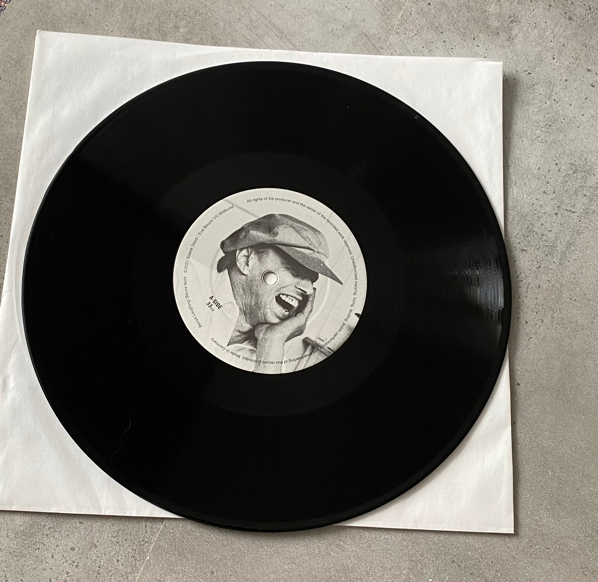 Steidl subsequently gave the original tapes to the young sound engineer Siegfried Schäfer, who set to work reducing bass and background noise, and created a final edit of 20 minutes. Steidl played this master to a delighted Beuys, who decided to issue it as an audiotape edition, in the mold of his 1969 recording Ja, Ja, Ja, Ja, Ja, Nee, Nee, Nee, Nee, Nee (Yes, Yes, Yes, Yes, Yes, No, No, No, No, No). Yet the master tape of Beuys Laughing was then sadly lost for a period of 46 years, only to resurface in 2020. Now, re-mastered and digitized by Schäfer and Pauler Acoustics, it is finally available to the public, in a limited-edition vinyl EP.