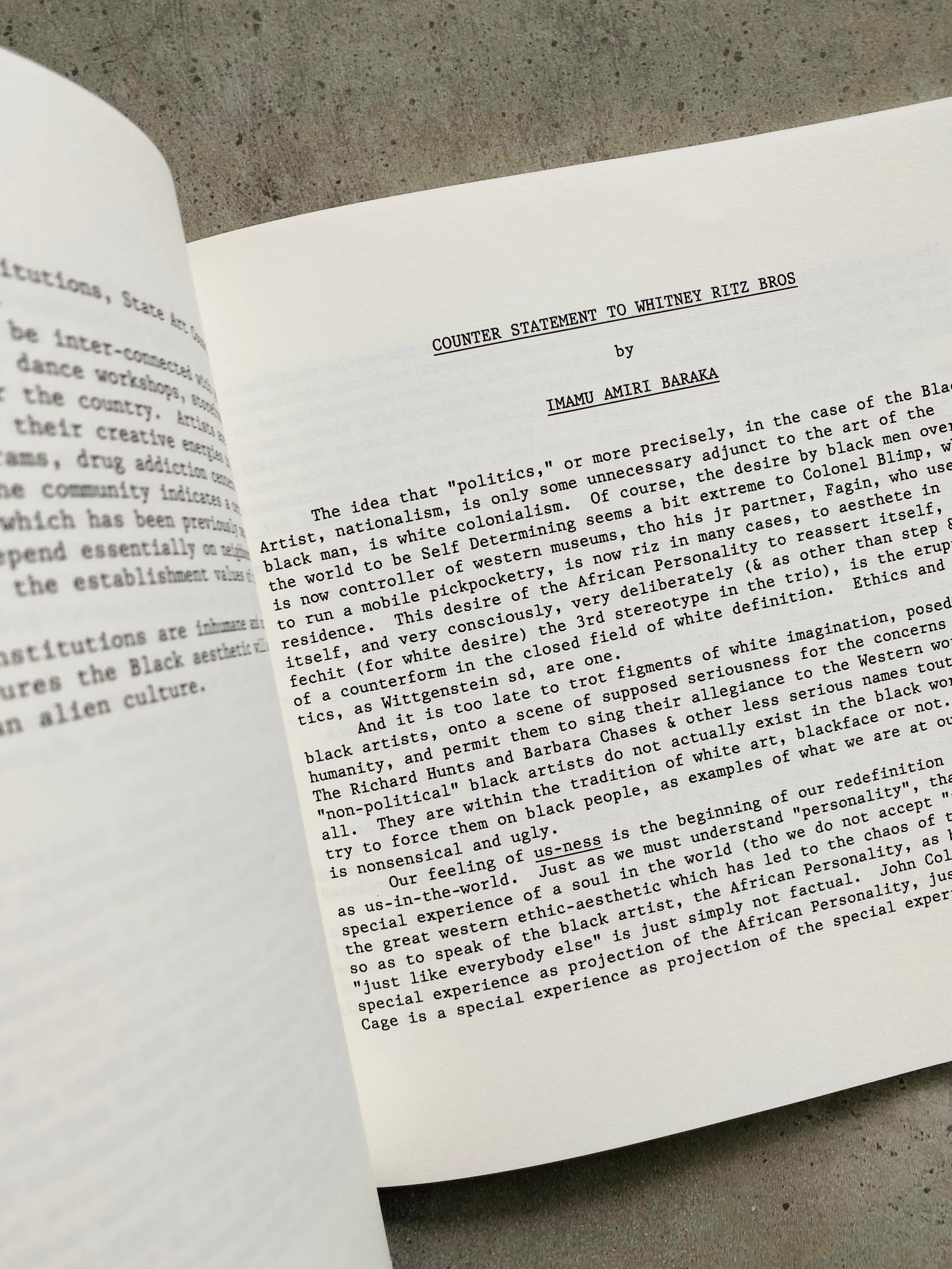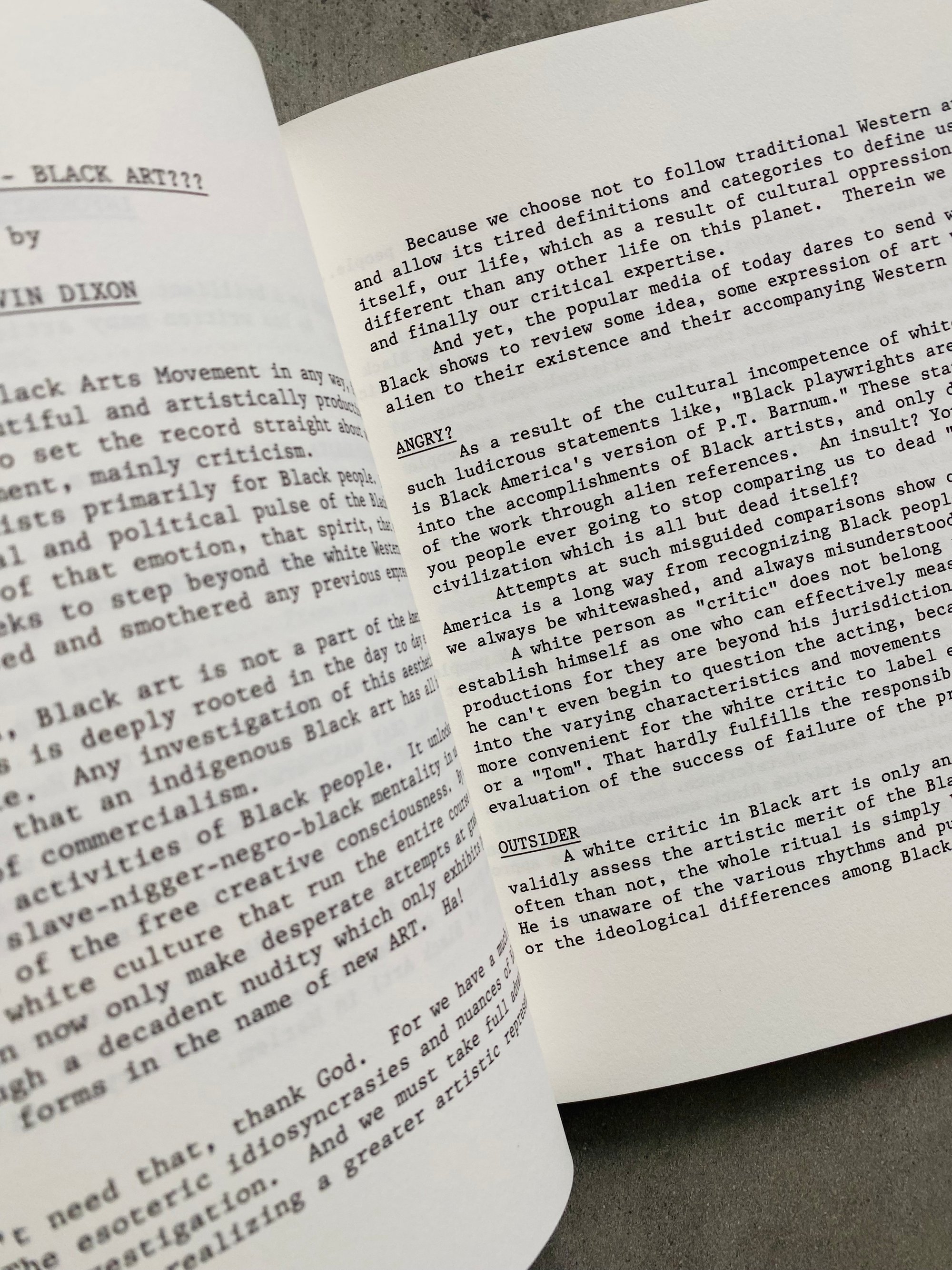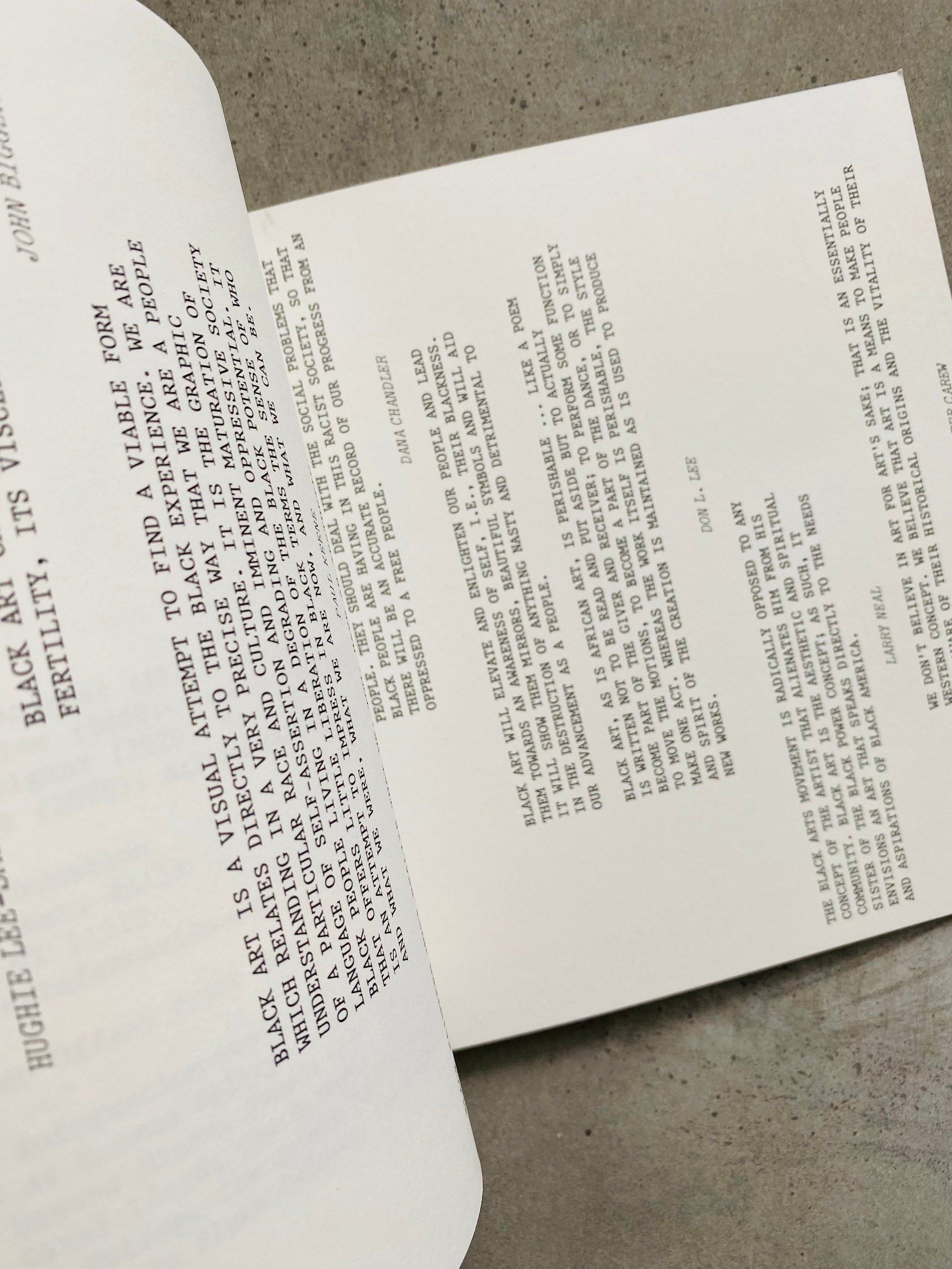 The artists featured in the publication position the Black Arts Movement outside of white, western frameworks, and articulate the movement as one created by and existing for Black people. Their essays condemn the attempts of museums and other white cultural institutions to tokenize, whitewash, and neutralize Black art, and call for immediate political and institutional reform and the self-determination of Black cultural producers. While the publication was created to respond to a particular historicized moment, the systemic problems that it addresses remain pervasive, making the artists’ potent critiques both timely and urgent.