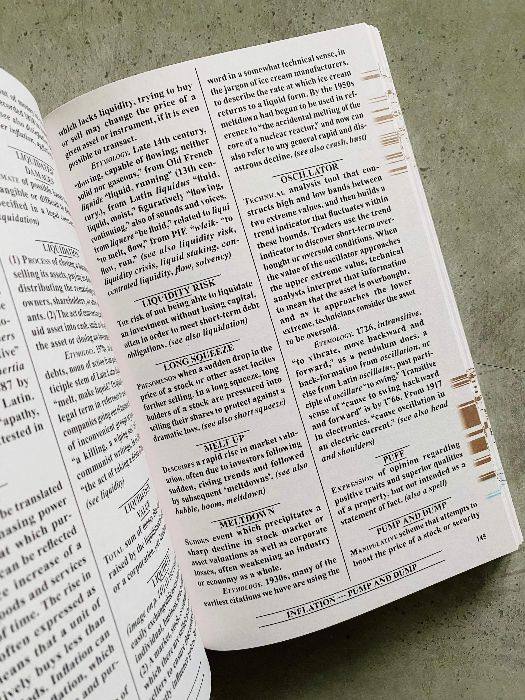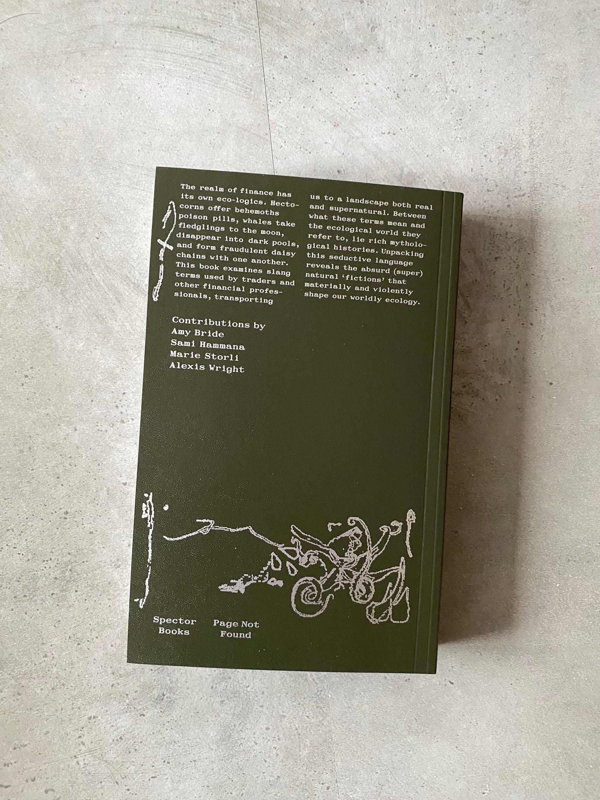 The realm of finance has its own ecological logic. Hectocorns offer behemoths poison pills, whales take fledglings to the moon, disappear into dark pools, and form fraudulent daisy chains with one another. The publication examines the slang terms used by traders and other financial professionals. Between what these terms mean and the ecological world they refer to, Benjaminsen and Casey detect a rich mythological history. Unpacking this charming language reveals the absurd (super) natural “fictions” that materially and violently shape our worldly ecology.
