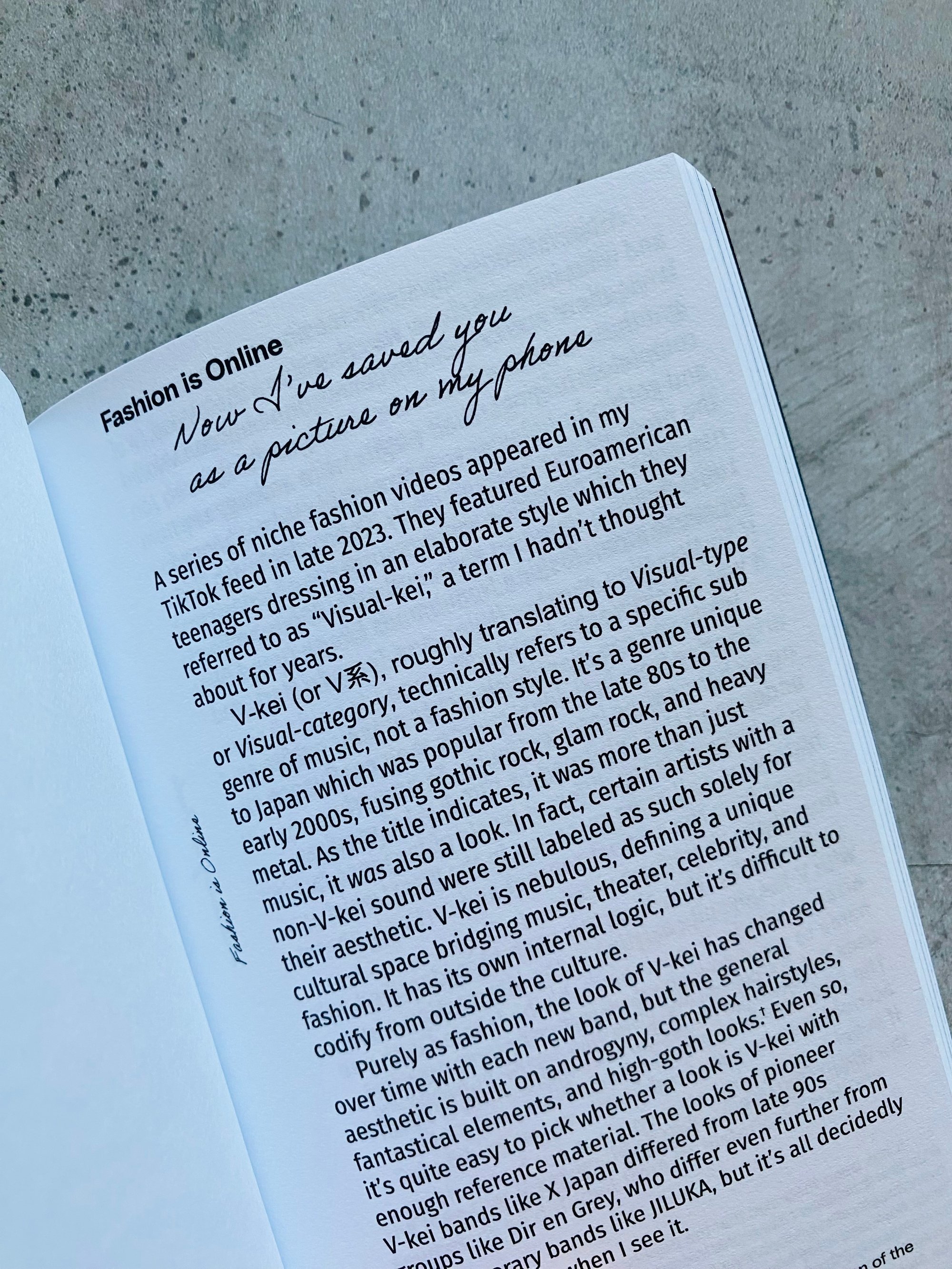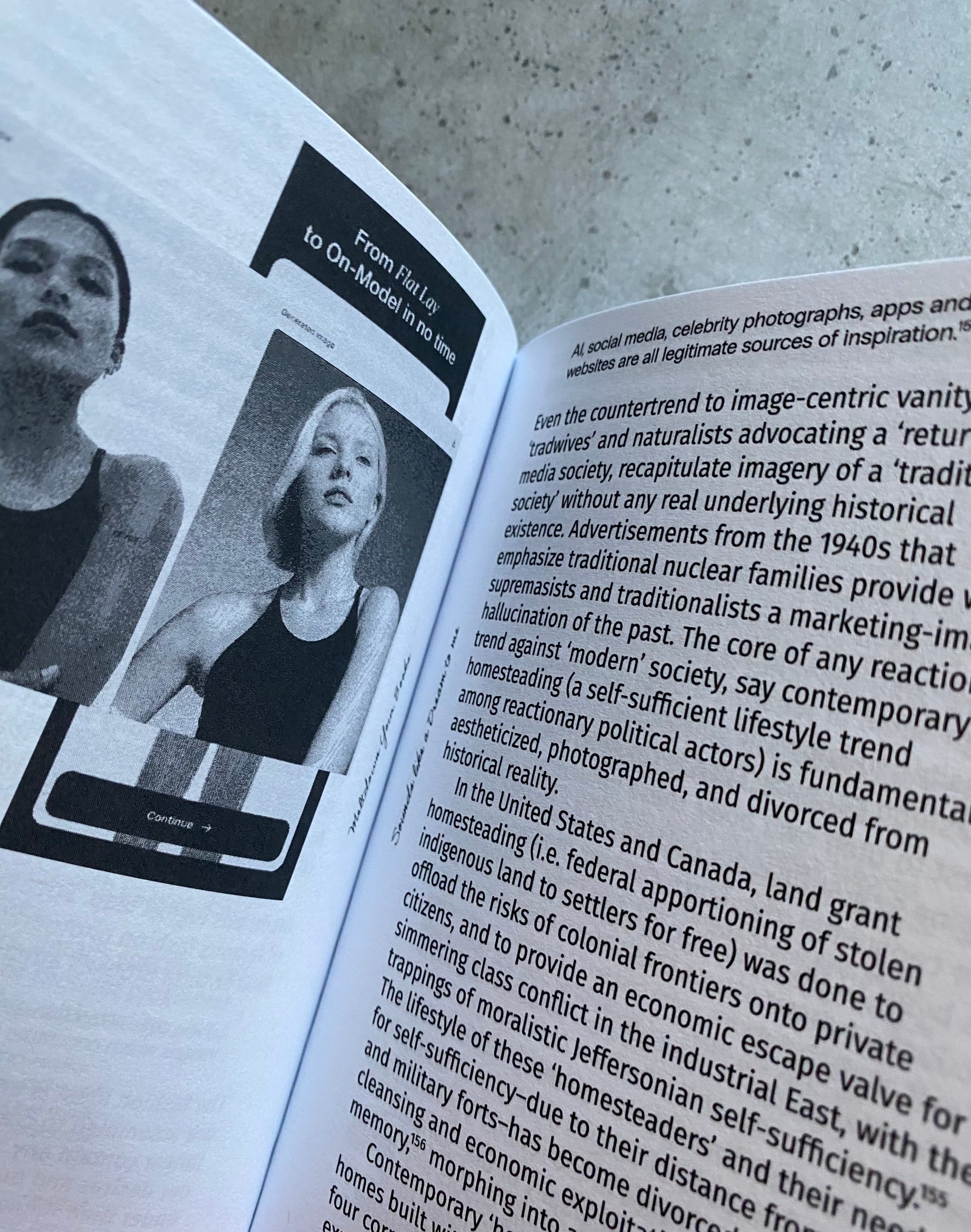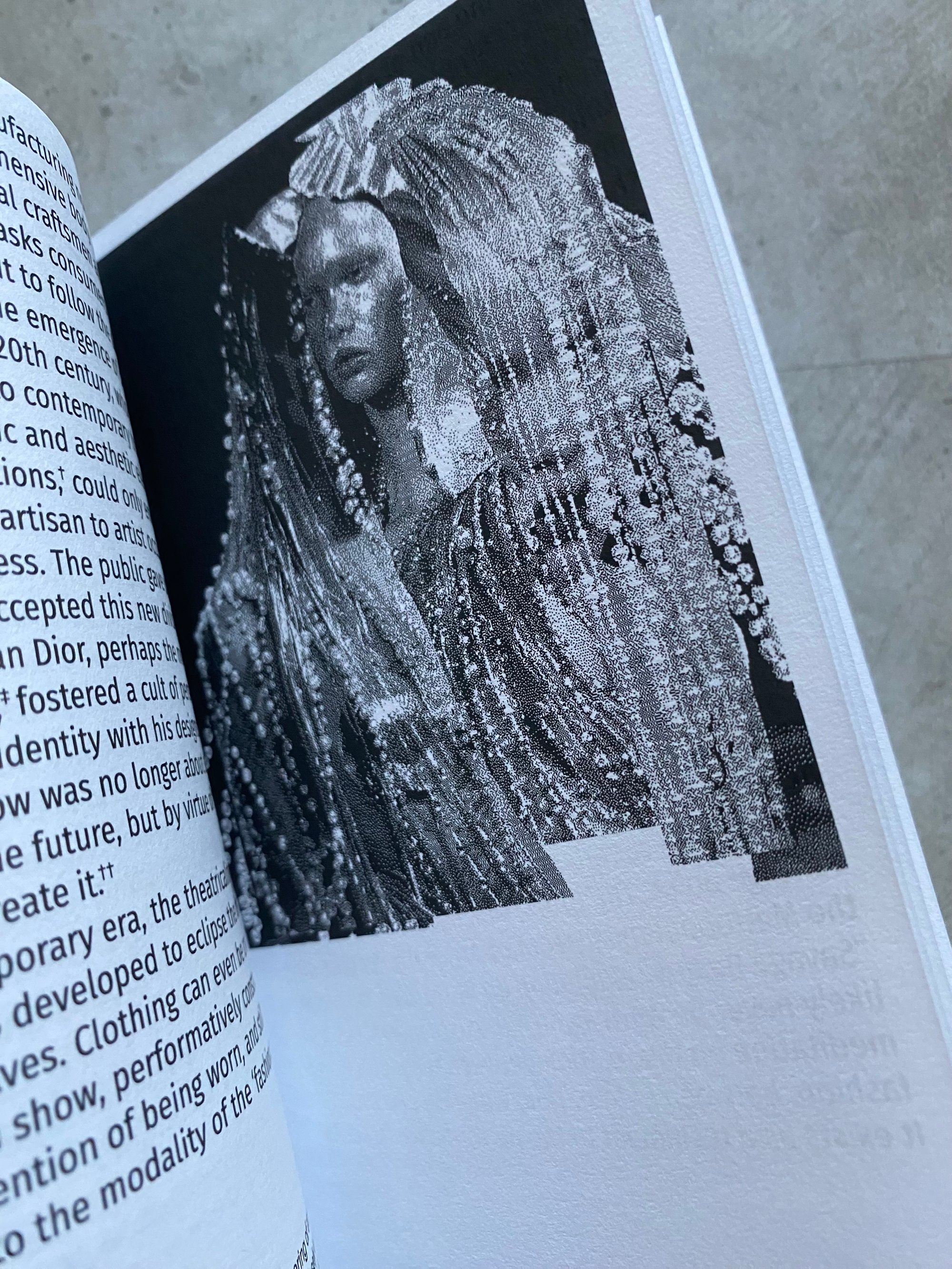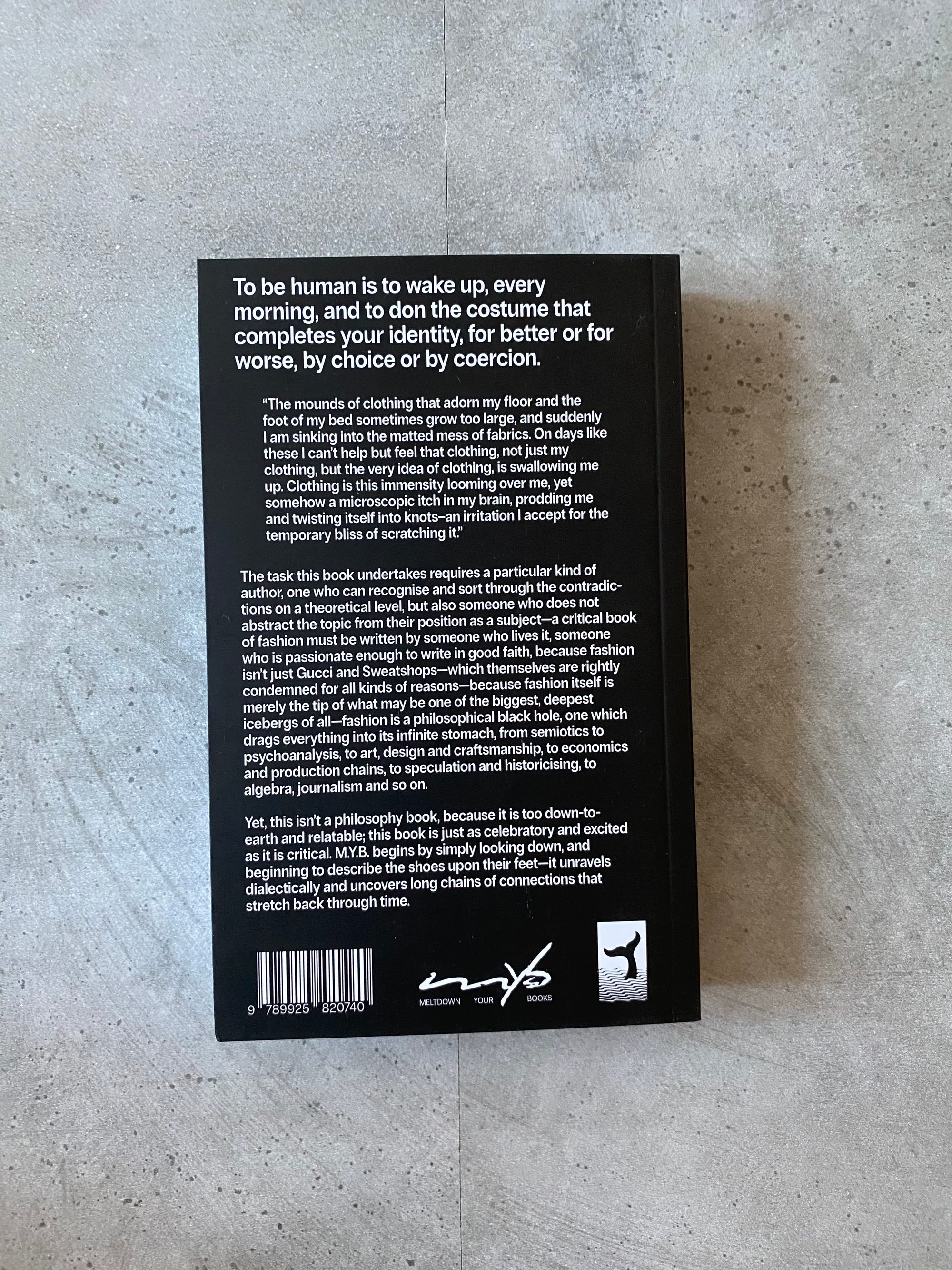 The task this book undertakes requires a particular kind of author, one who can recognise and sort through the contradictions on a theoretical level, but also someone who does not abstract the topic from their position as a subject—a critical book of fashion must be written by someone who lives it, someone who is passionate enough to write in good faith, because fashion isn’t just Gucci and Sweatshops—which themselves are rightly condemned for all kinds of reasons—because fashion itself is merely the tip of what may be one of the biggest, deepest ice bergs of all—Fashion is a philosophical black hole, one which drags everything into its infinite stomach, from semiotics to psychoanalysis, to art, design and craftsmanship, to economics and production chains, to speculation and historicising, to algebra, journalism and so on.