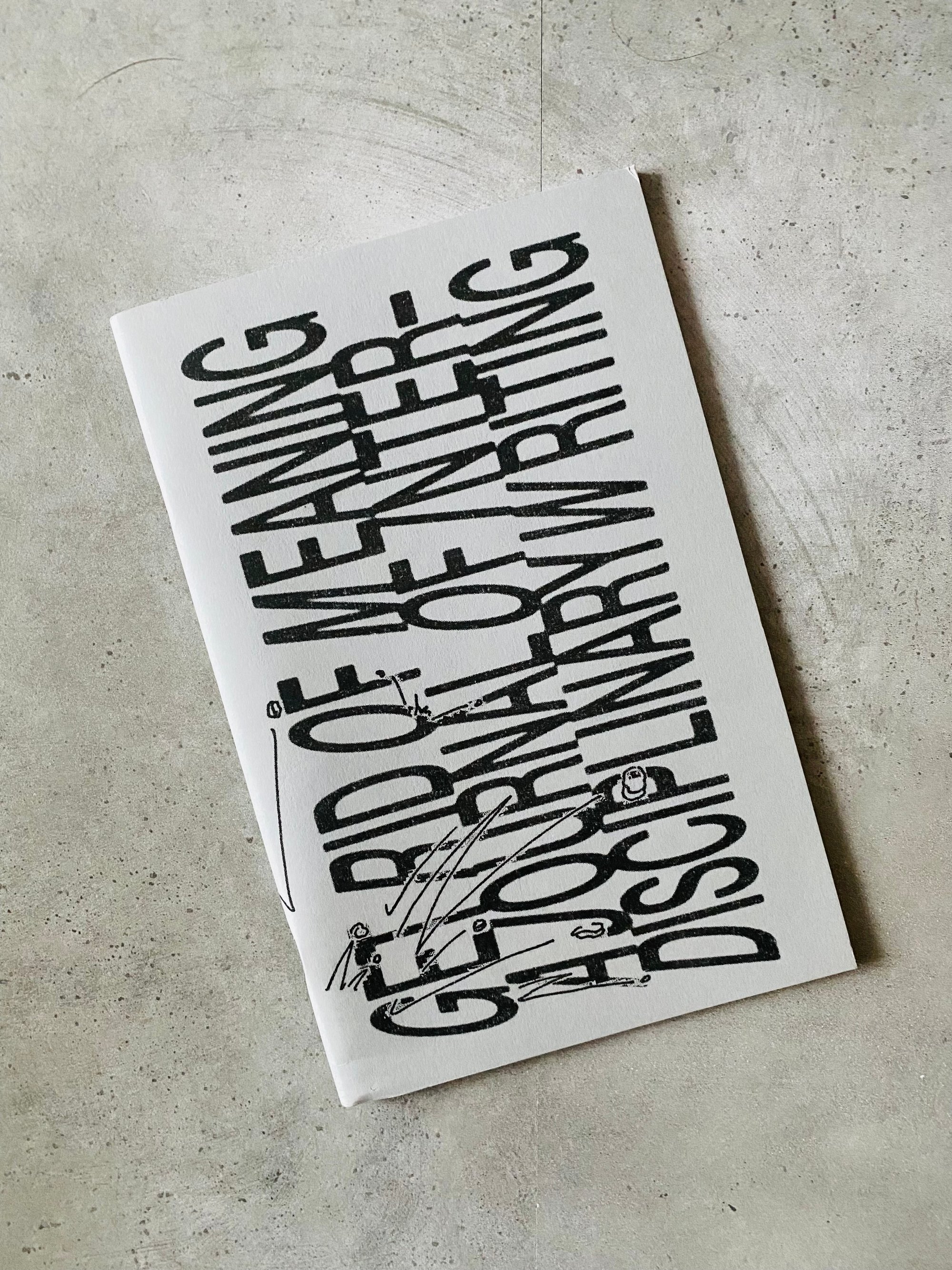 Get Rid of Meaning: A Journal of Interdisciplinary Writing is a biannual periodical by Sticky Fingers Publishing, exploring how and where meaning is produced, maintained and distributed. This second issue traverses bomba cinemas in the Philippines, the fourth-largest moon in the solar system, and a closet of winter coats. Together, these works provide strategies for surviving an intentionally nonsensical political landscape.