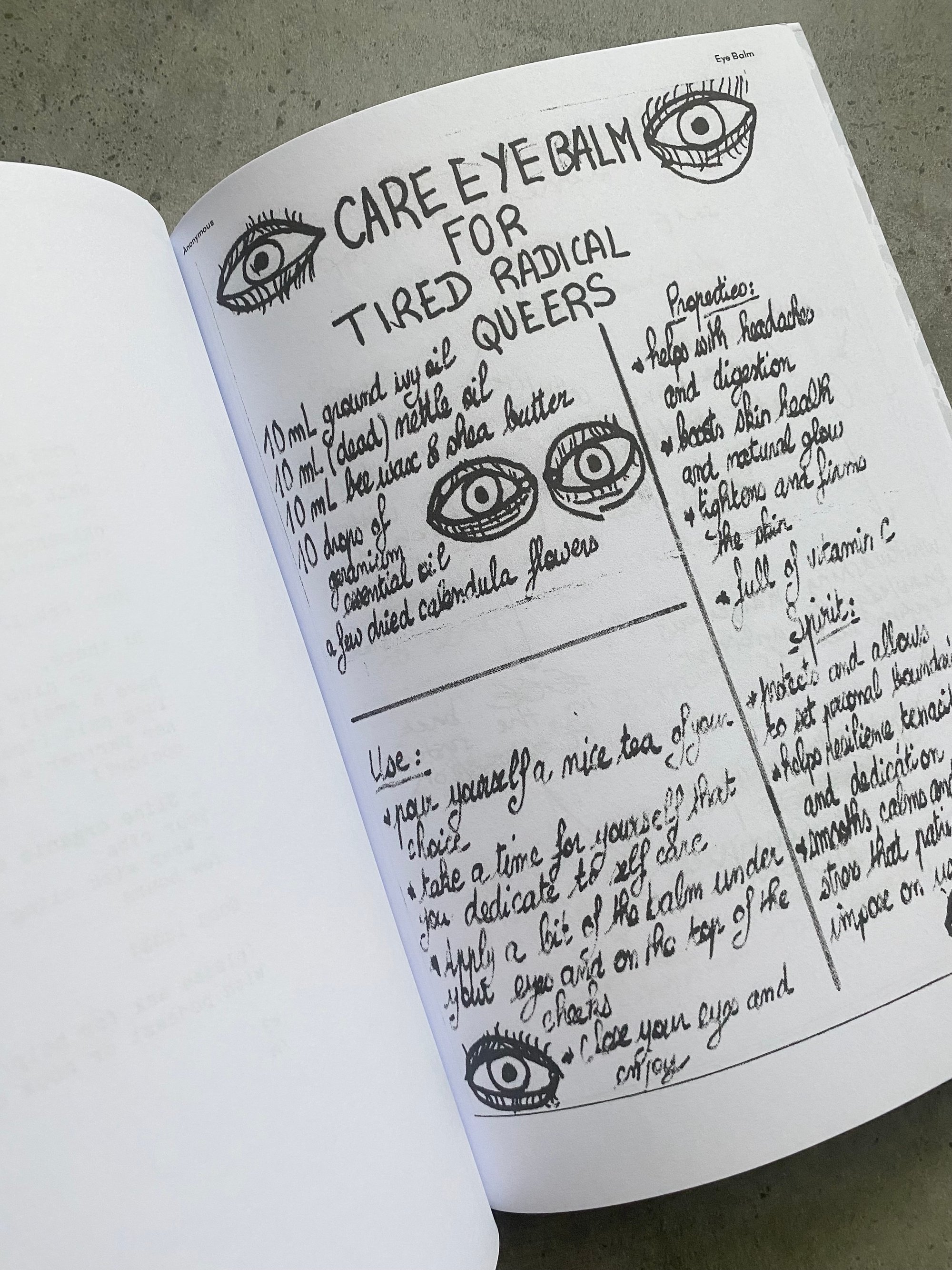 Archiving self-sourcing, DIY healing methods and curing recipes, this publication brings together contributions from over 15 people in the form of recipes, instructions, poems, artwork and writings. They contemplate on the topics of self healing practices (old and new) in a world that still embodies medical misogyny, and doesn’t always manage to care for each body and mind in needed ways.