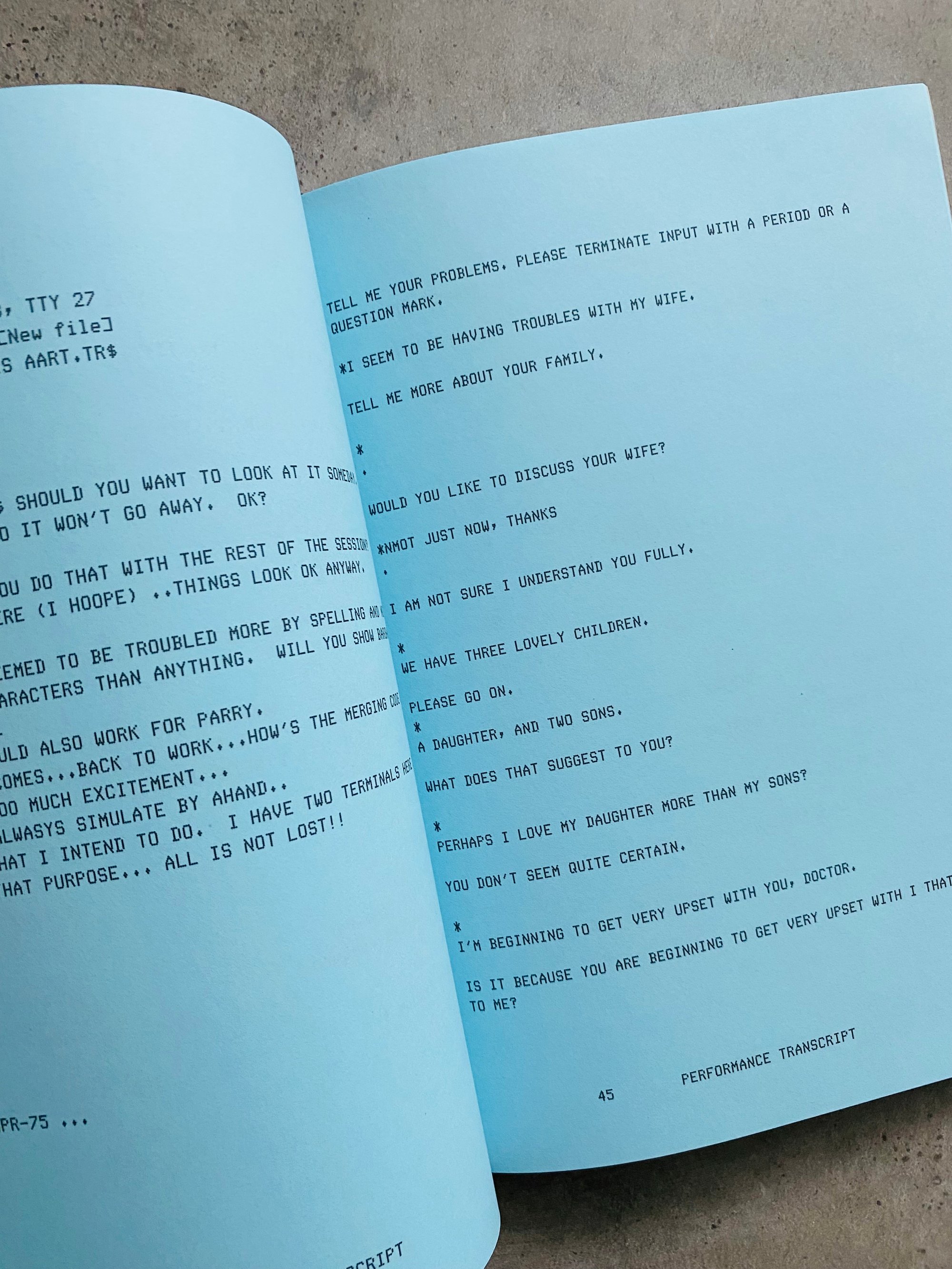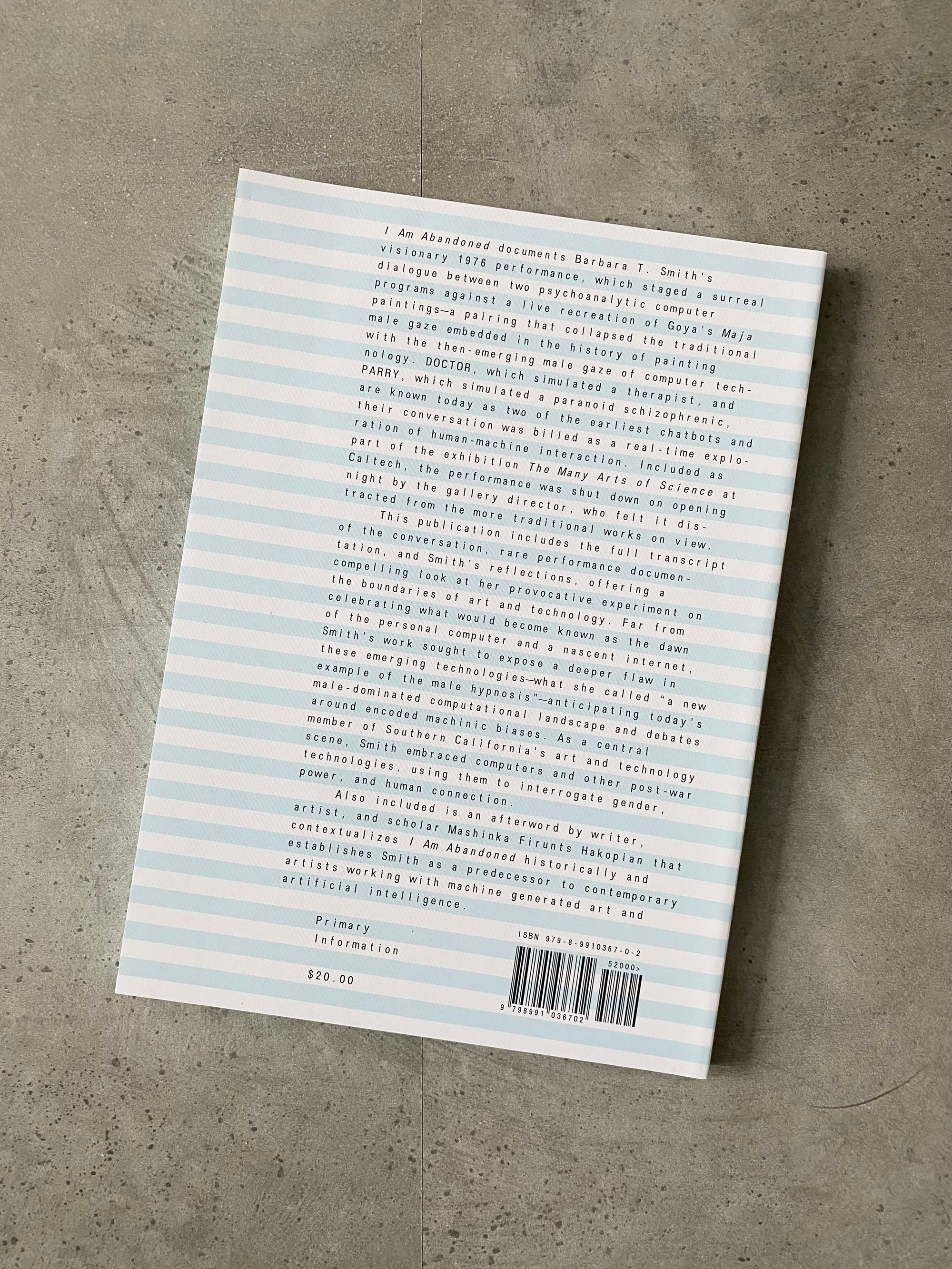 I Am Abandoned documents a little-known, but visionary performance by Barbara T. Smith. Taking place in 1976, it featured a conversation in real time between two psychoanalytic computer programs (known today as two of the earliest chatbots) alongside a staging of Francisco Goya’s The Naked Maja (1795–1800) and The Clothed Maja (1800–1807), in which the artist projected an image of the famous painting on top of a female model. The publication includes a full transcript of the “conversation” between the two programs; documentation and ephemera from the performance; Smith’s reflections on the night; and an afterword by scholar and artist Mashinka Firunts Hakopian.