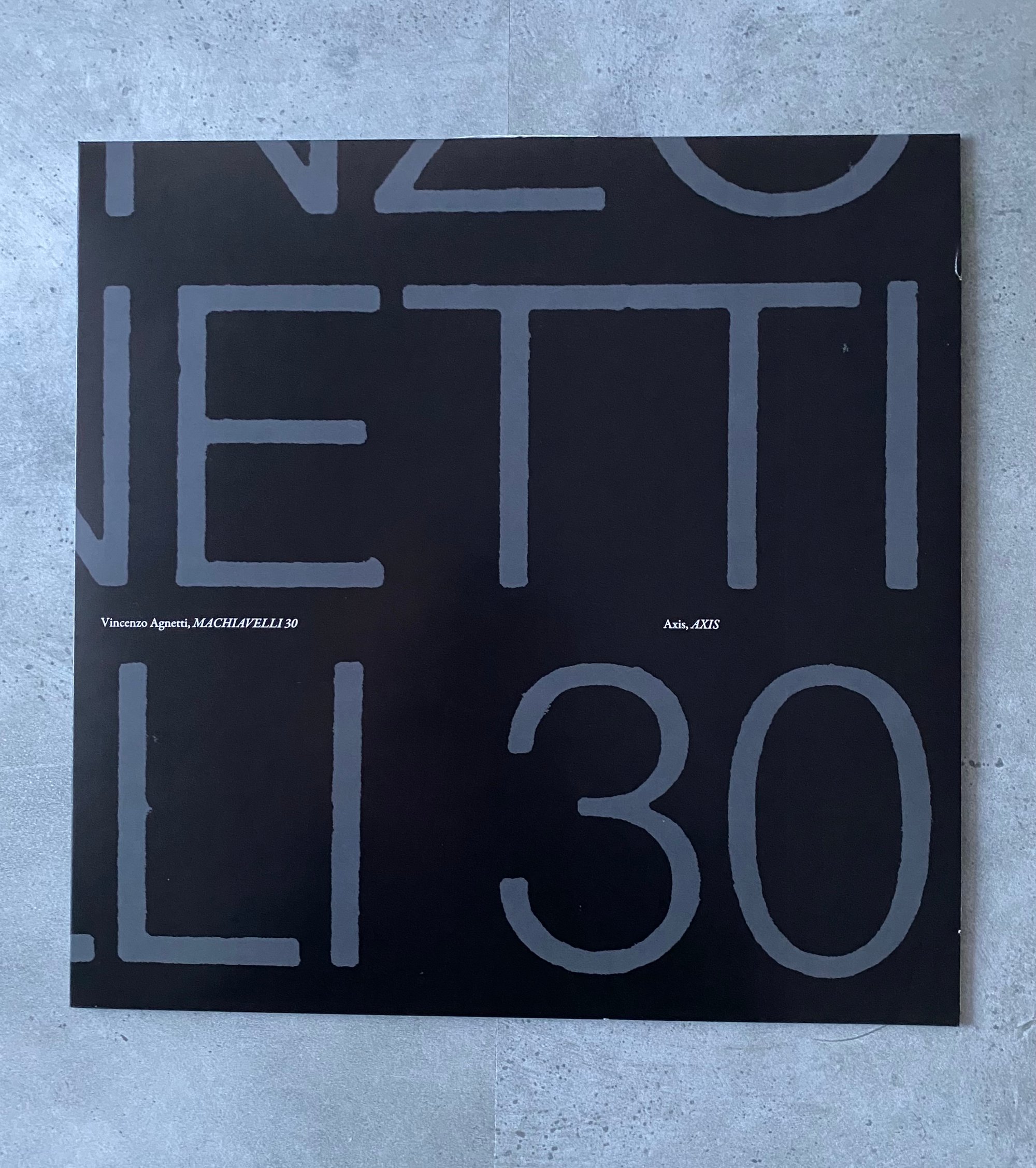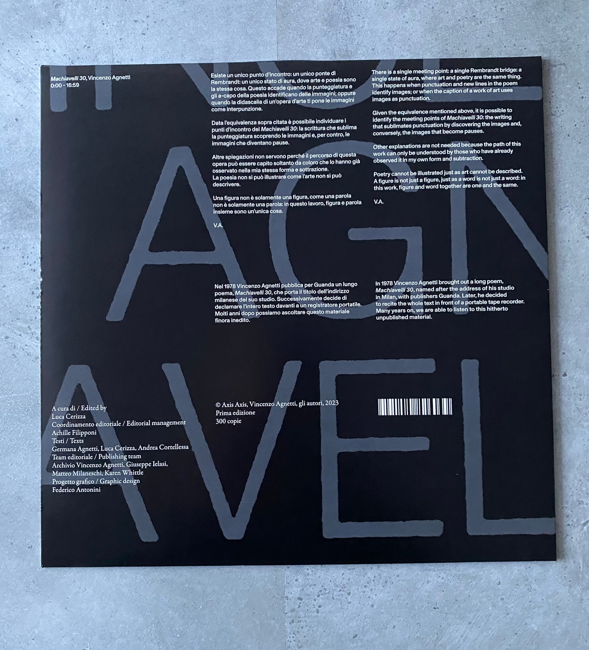Axis Axis is pleased to release the audio format of one of the most important oeuvres in the field of Italian art and experimental poetry: Machiavelli 30 by Vincenzo Agnetti. Putting the last piece starting from the original work, conceived as a book and published by Guanda in 1978, Agnetti decided to recite the whole text in front of a portable tape recorder, and the 17’ audio in this vinyl is the output hitherto unpublished.