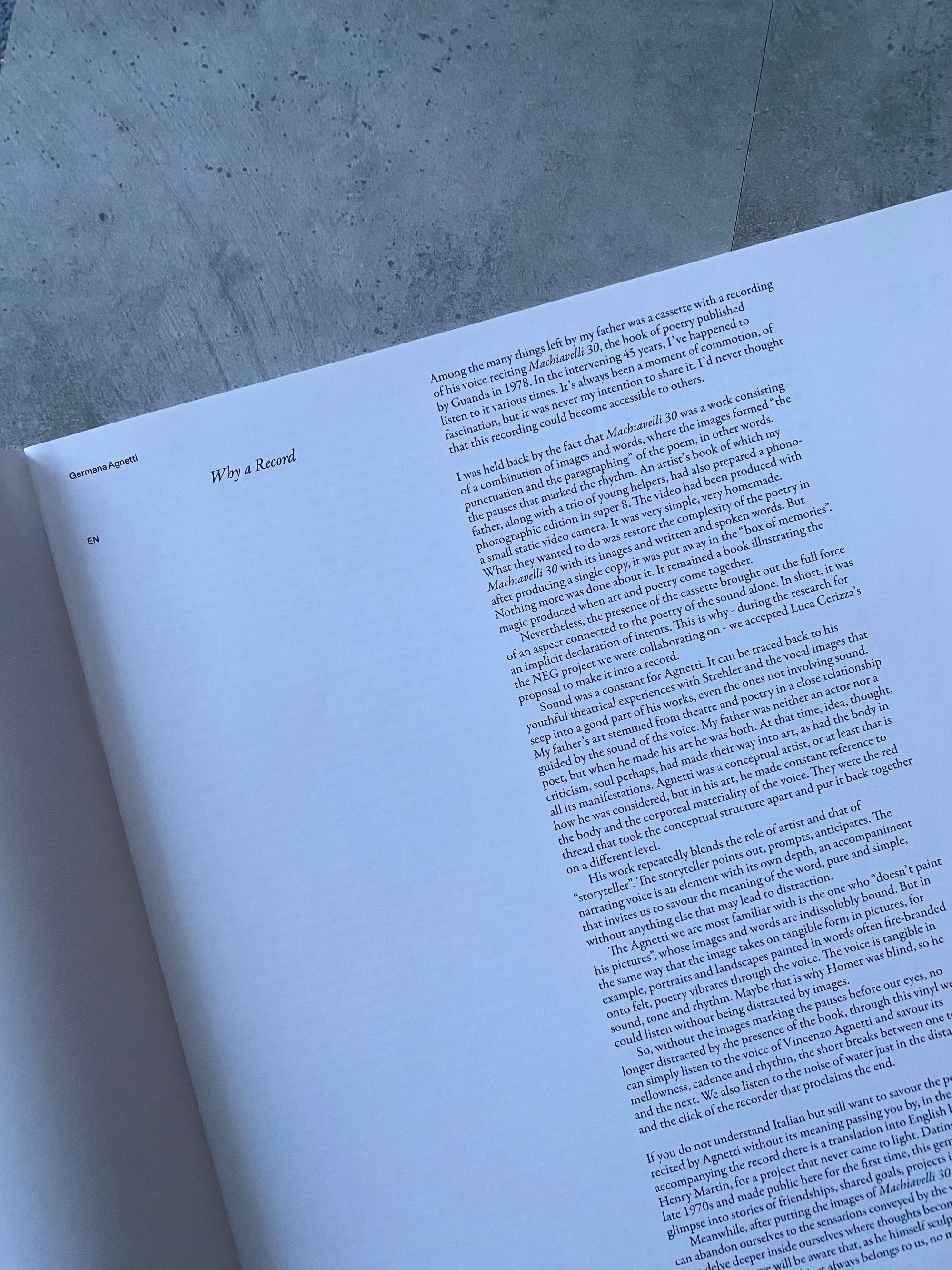 The edition is curated by Luca Cerizza and contains also a sixteen pages stapled glossy booklet with essays by Germana Agnetti, Andrea Cortellessa and the editor himself, with complete original translation by Henry Martin.