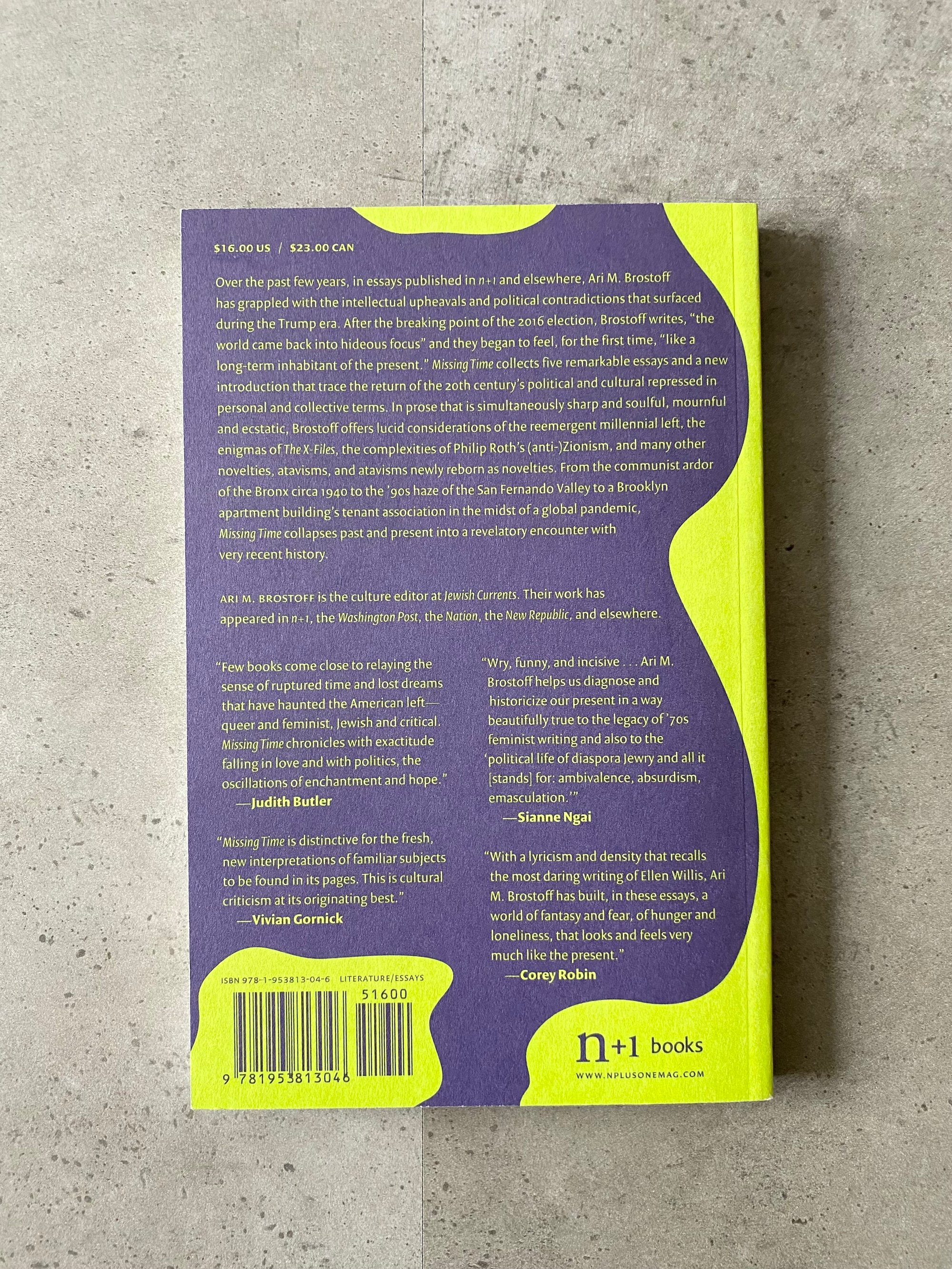 Missing Time collects five remarkable essays and a new introduction that trace the return of the 20th century’s political and cultural repressed in personal and collective terms. In prose that is simultaneously sharp and soulful, mournful and ecstatic, Brostoff offers lucid considerations of the reemergent millennial left, the enigmas of the X-Files, the complexities of Philip Roth’s (anti-)Zionism, and other novelties, atavisms, and atavisms newly reborn as novelties. From the communist ardor of the Bronx circa 1940 to the ’90s haze of the San Fernando Valley to a Brooklyn apartment building’s tenants’ association in the midst of a global pandemic, Missing Time collapses past and present into a revelatory encounter with very recent history.