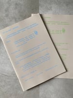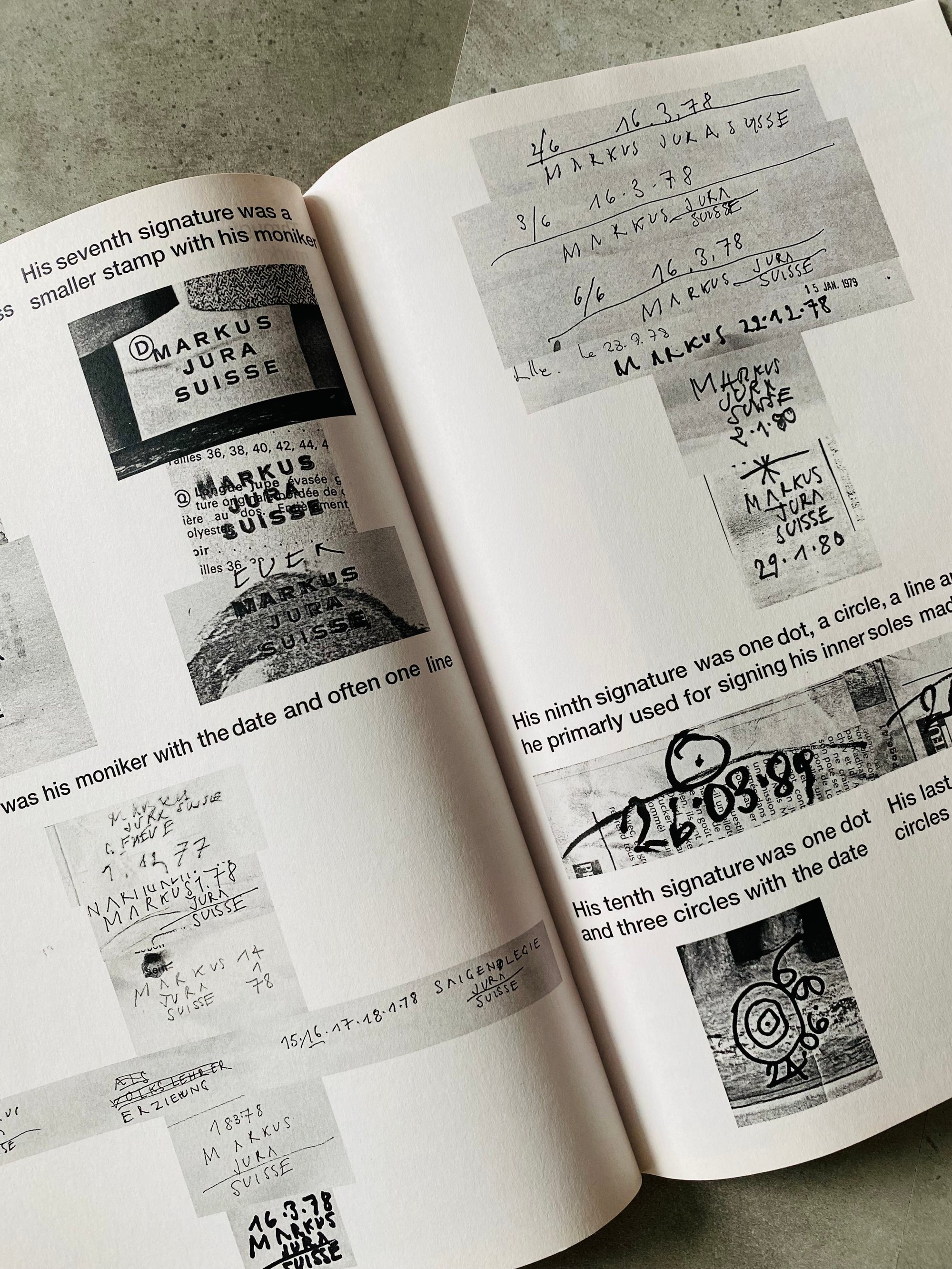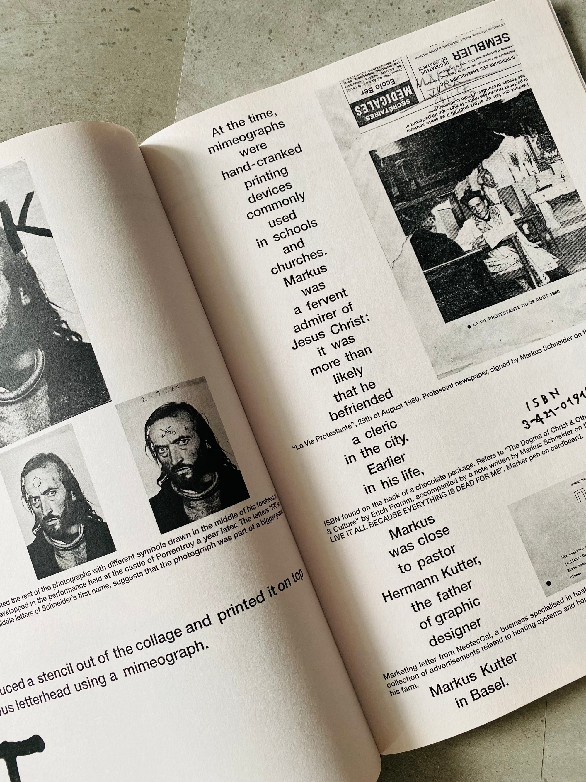 It was typeset according to a stamp that MJS produced in 1978. Each word has been manually laid out one by one. All of the pages come with variations of layouts inspired by his collage process blending original documents with content produced for the publication.