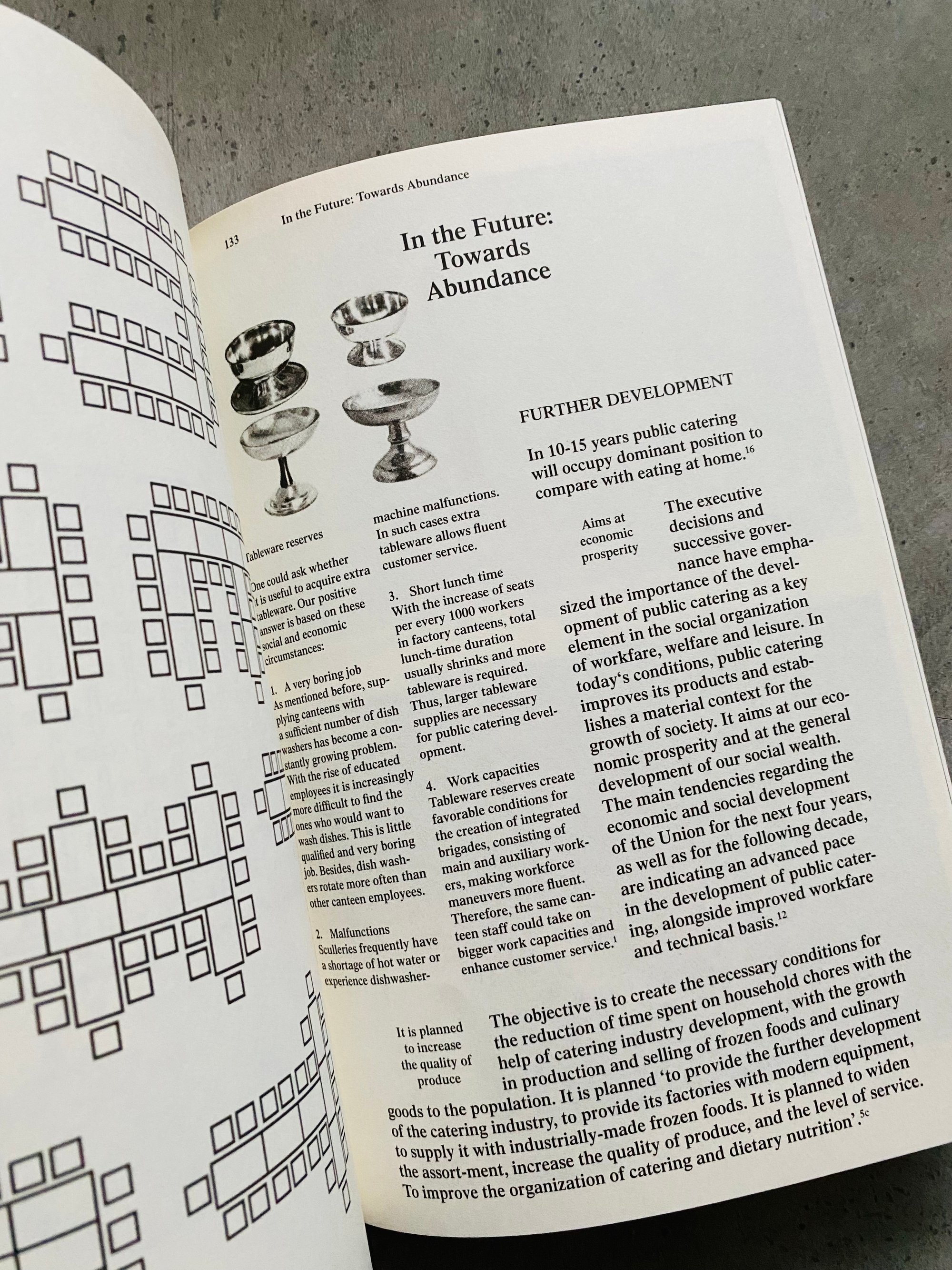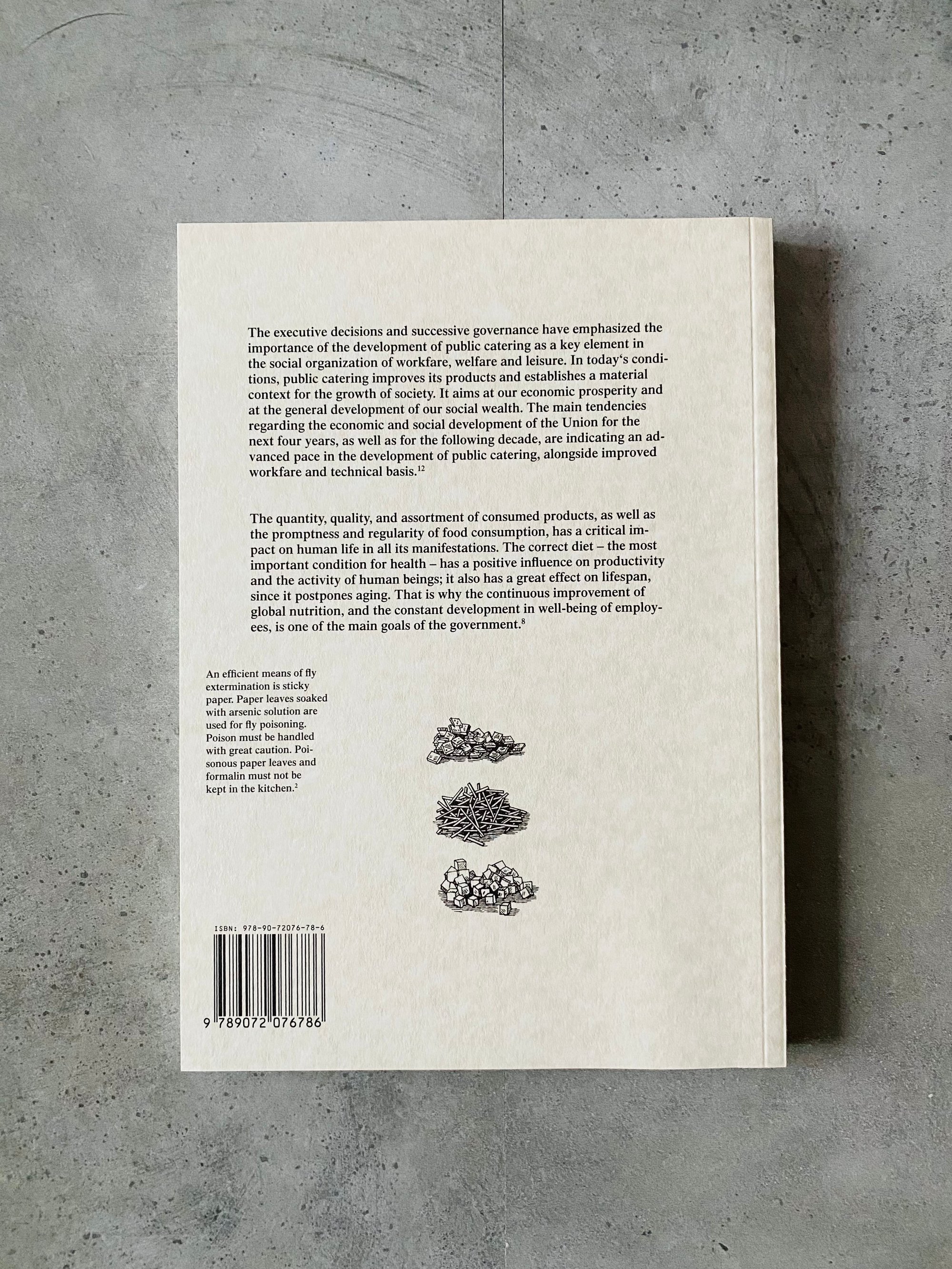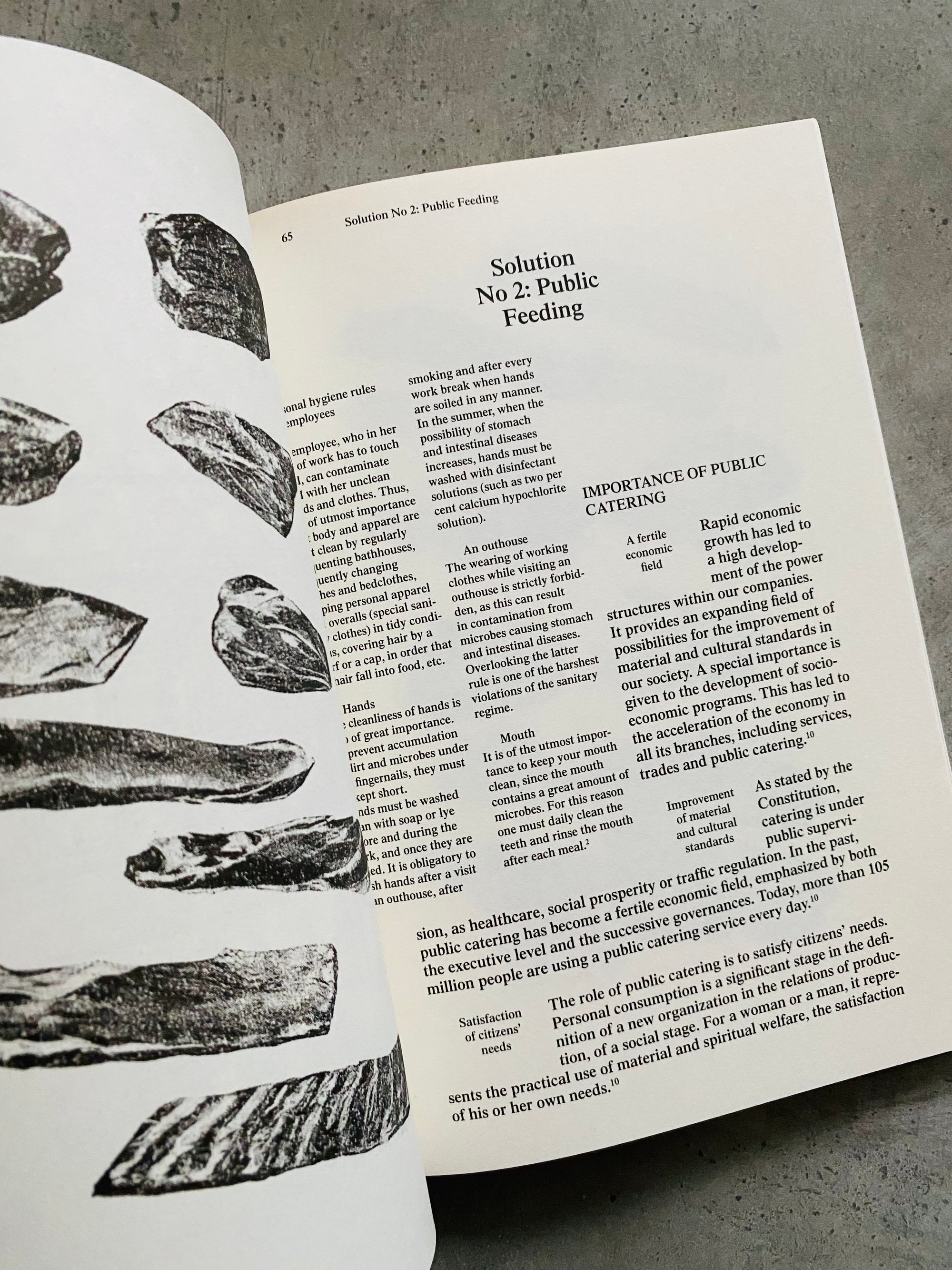 On continuous and systematic nutrition improvement is a continuation of Indre Klimaite project and publication Canteen Guide 2009. It is a narrative of human culture within a system. It is insider view that lifts sheets to ideology mechanism, it’s propaganda and practice. This publication extends history and itself becomes a plan for tomorrow. Research itself is based on textual and visual materials collected from Soviet public catering books between 1935 until 1990. Material spans over a broad range of documents, from official sanitation memorandum to archeological photographs, from women liberation slogans to dishwashing instructions, from technical plans for the classification of potatoes to dinner room schemes, from soviet gastronomy recipes to sanitary norms and measures to fight rodents and microbes. Human life as a never stopping potatoes washing machine.