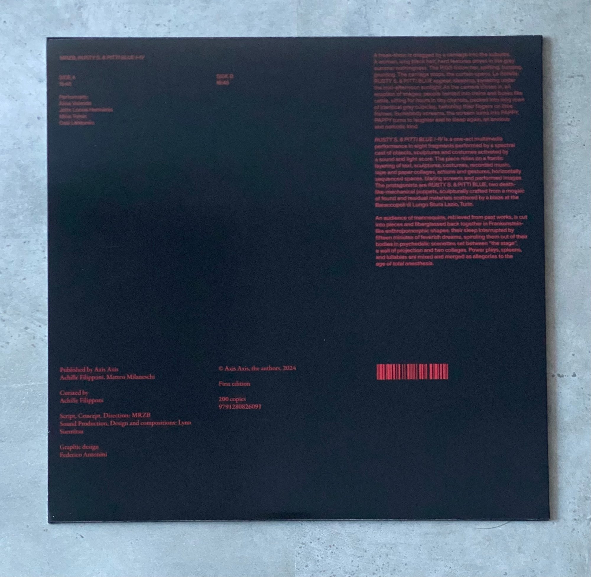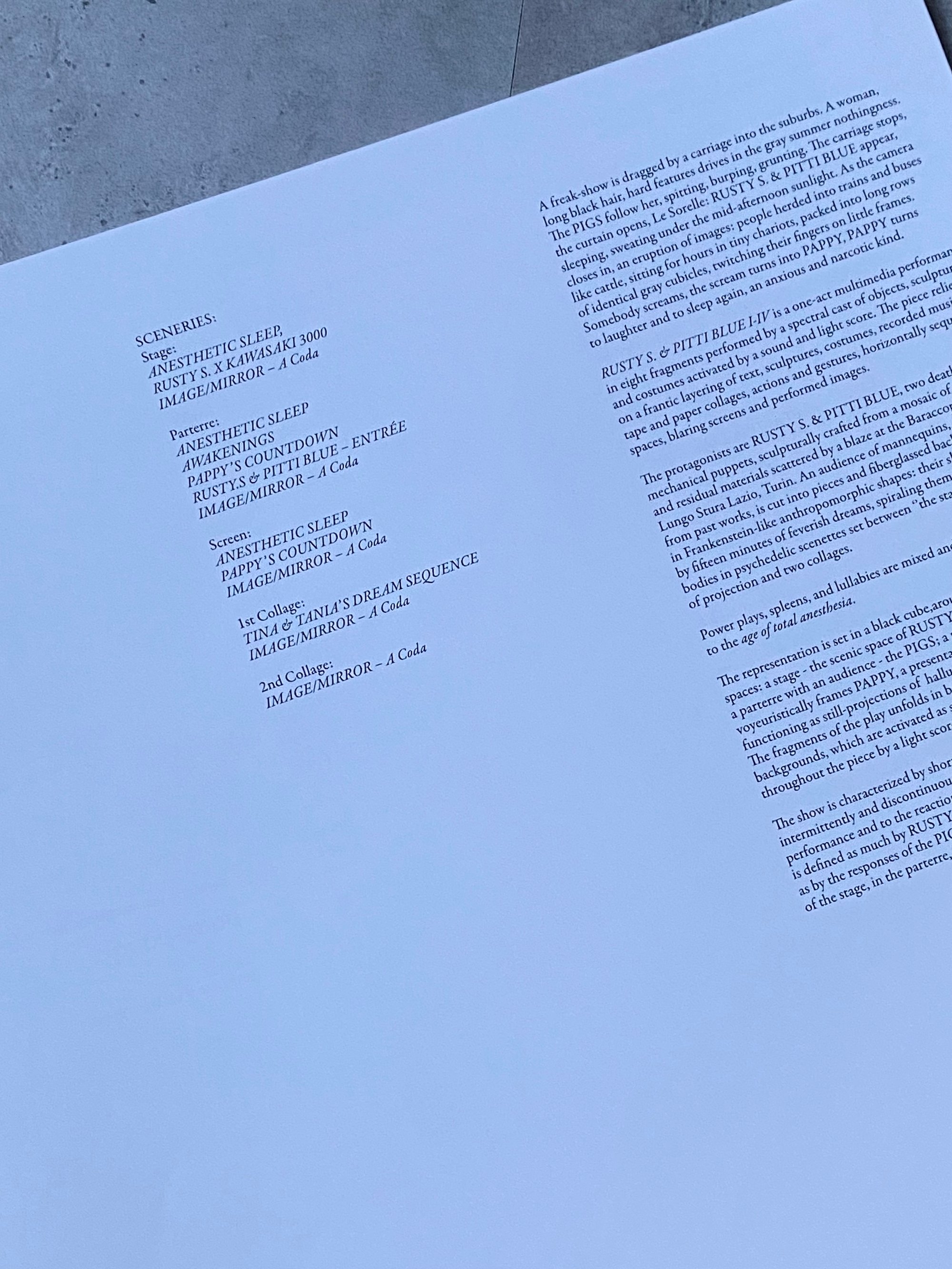 RUSTY S. & PITTI BLUE I-IV is a one-act multimedia performance in eight fragments performed by a spectral cast of objects, sculptures and costumes activated by a sound and light score. The piece relies on a frantic layering of text, sculptures, costumes, recorded music, tape and paper collages, actions and gestures, horizontally sequenced spaces, blaring screens and performed images. The protagonists are RUSTY S. & PITTI BLUE, two death-like-mechanical puppets, sculpturally crafted from a mosaic of found and residual materials scattered by a blaze at the Baraccopoli di Lungo Stura Lazio, Turin.
