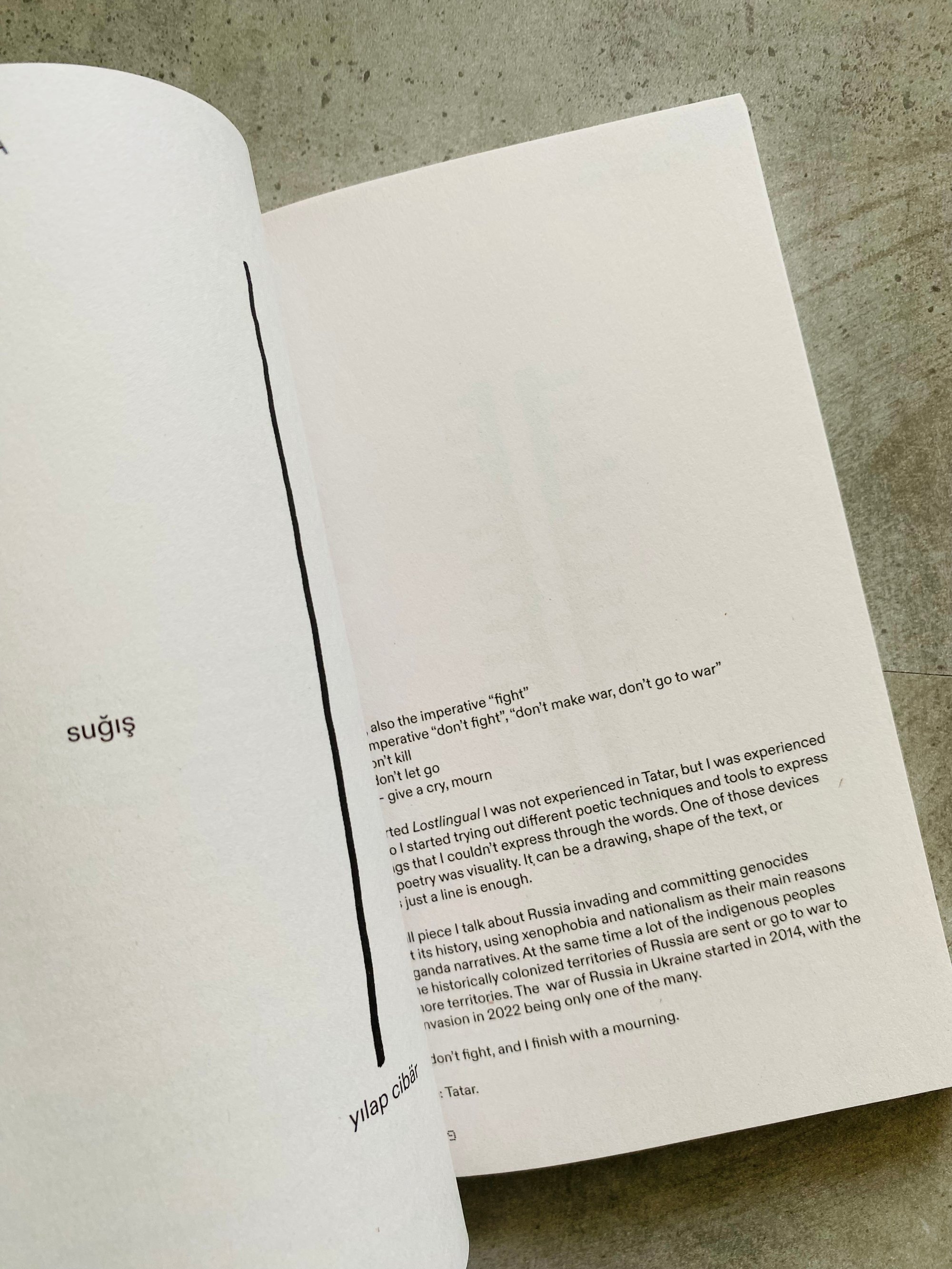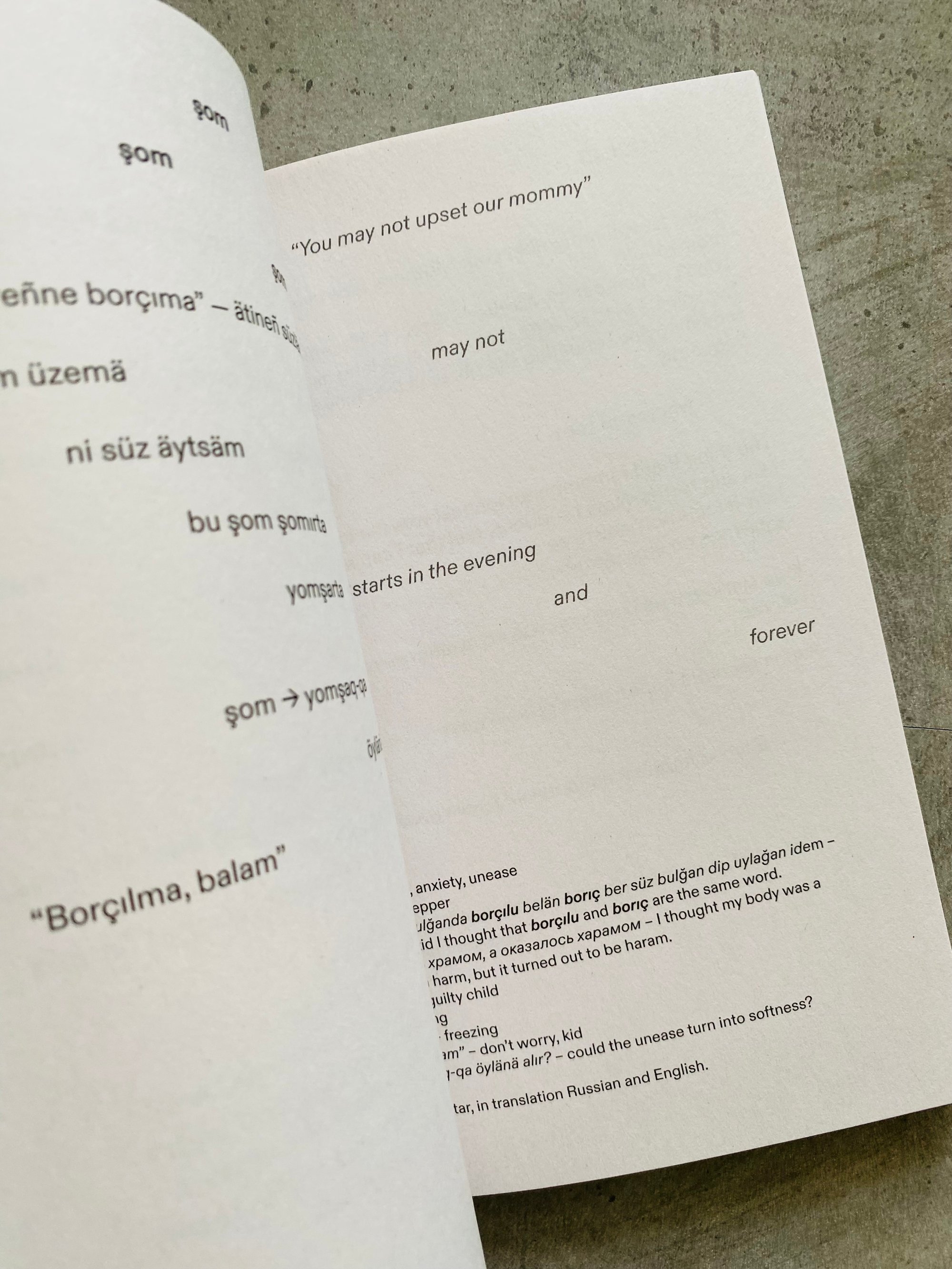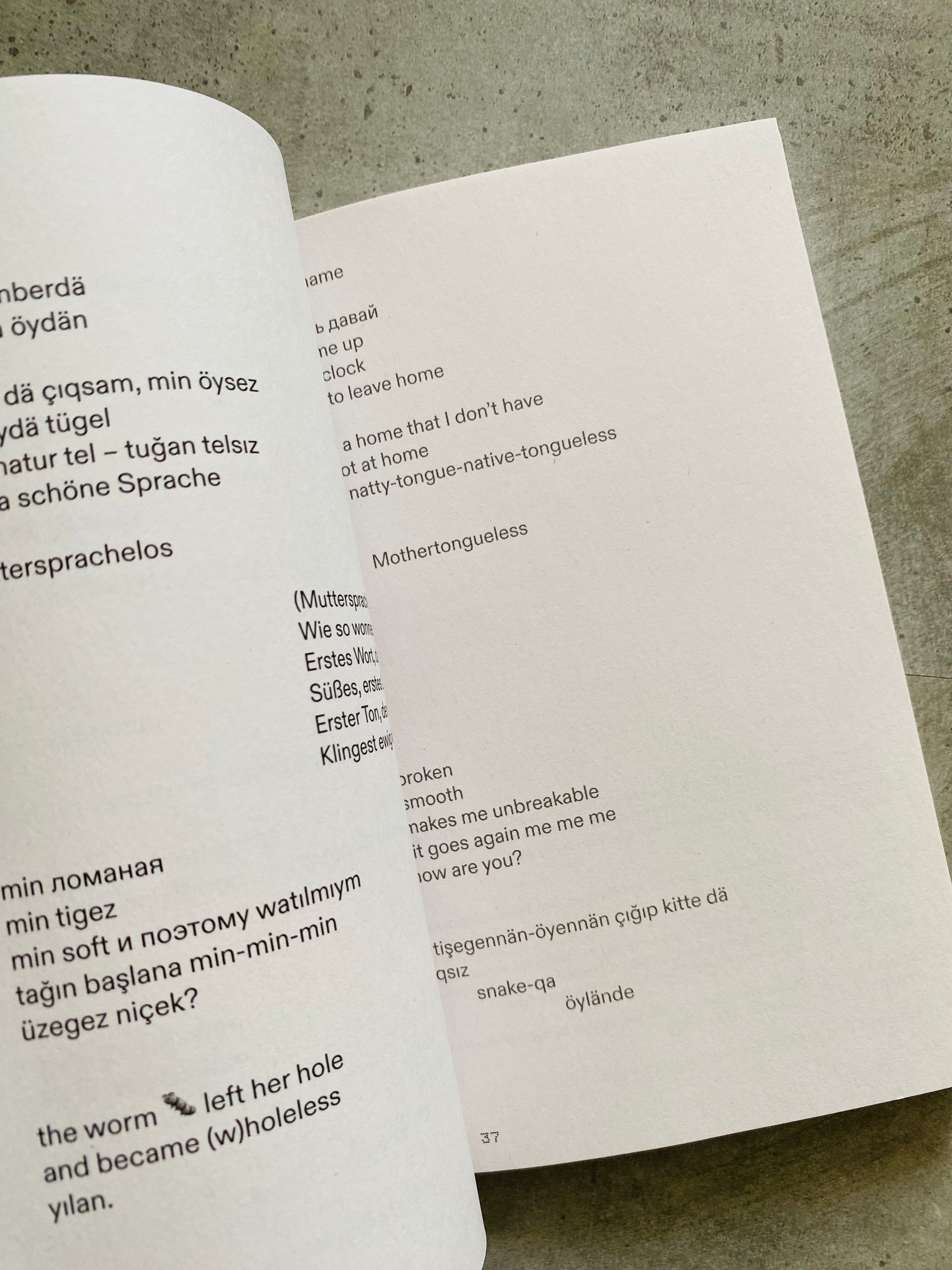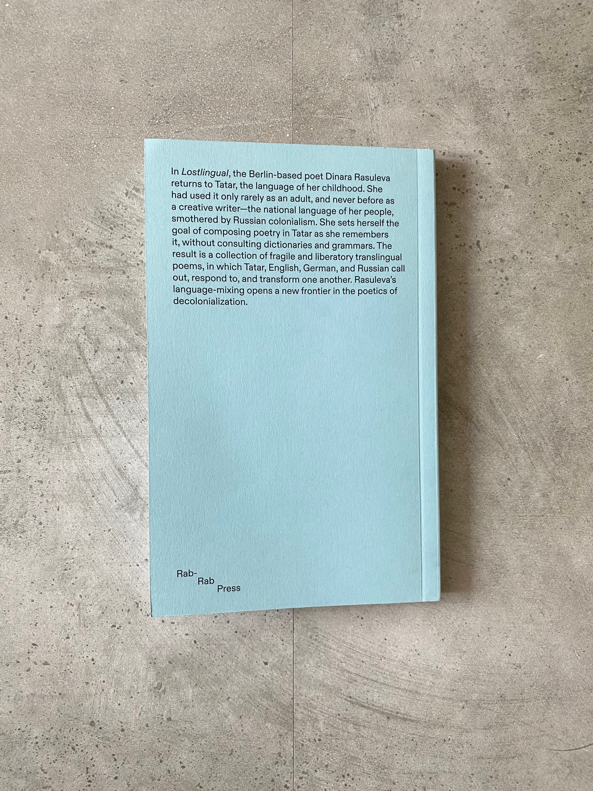 Lostlingual by Dinara Rasuleva is the first volume of the sdvig series, dedicated to translingual avant-garde writing. In this volume, Rasuleva, a Berlin-based poet, returns to Tatar, the language of her childhood. She had used it only rarely as an adult, and never before as a creative writer—the national language of her people, smothered by Russian colonialism. She sets herself the goal of composing poetry in Tatar as she remembers it, without consulting dictionaries and grammars. The result is a collection of fragile and liberatory translingual poems, in which Tatar, English, German, and Russian call out, respond to, and transform one another.