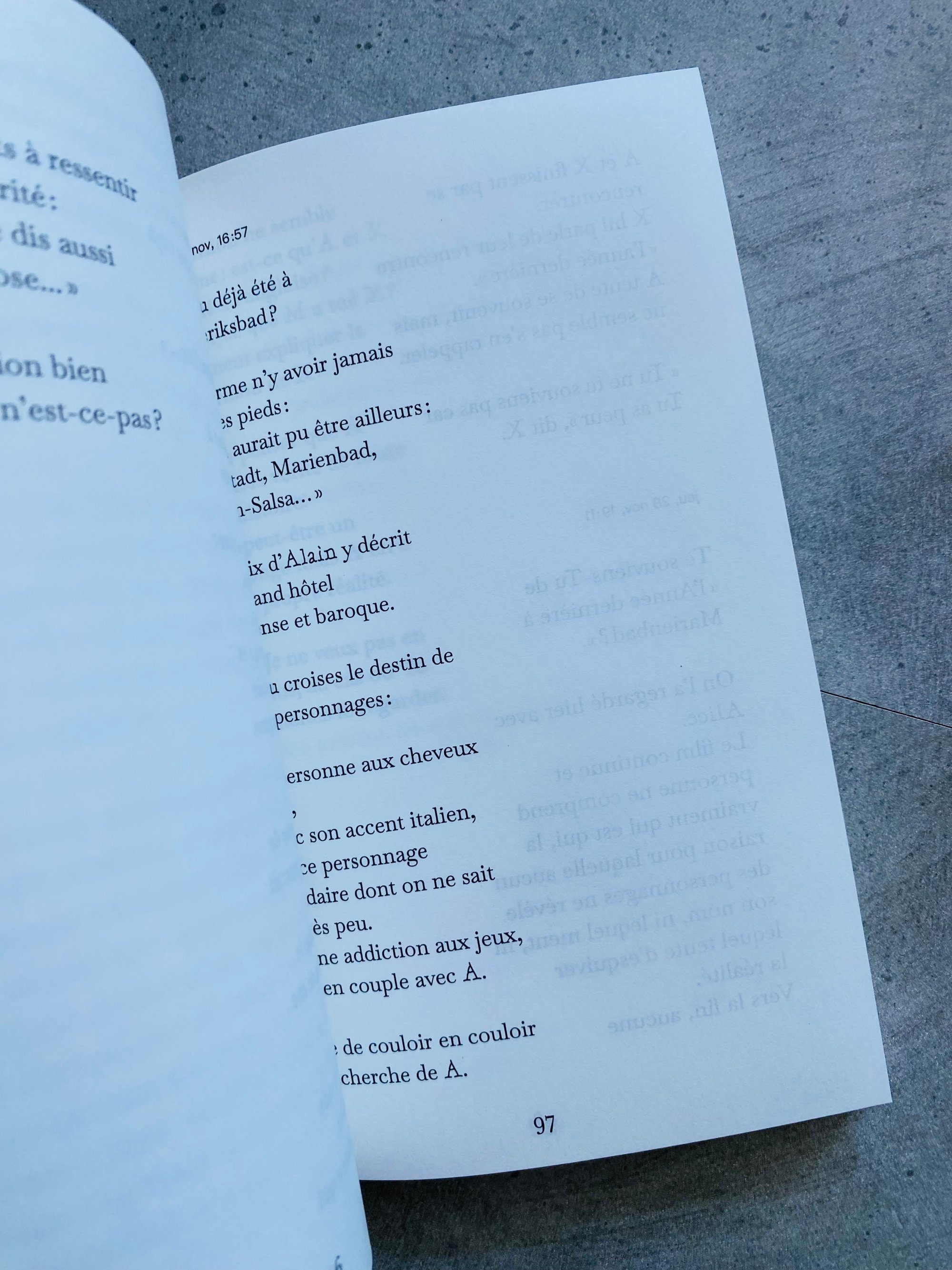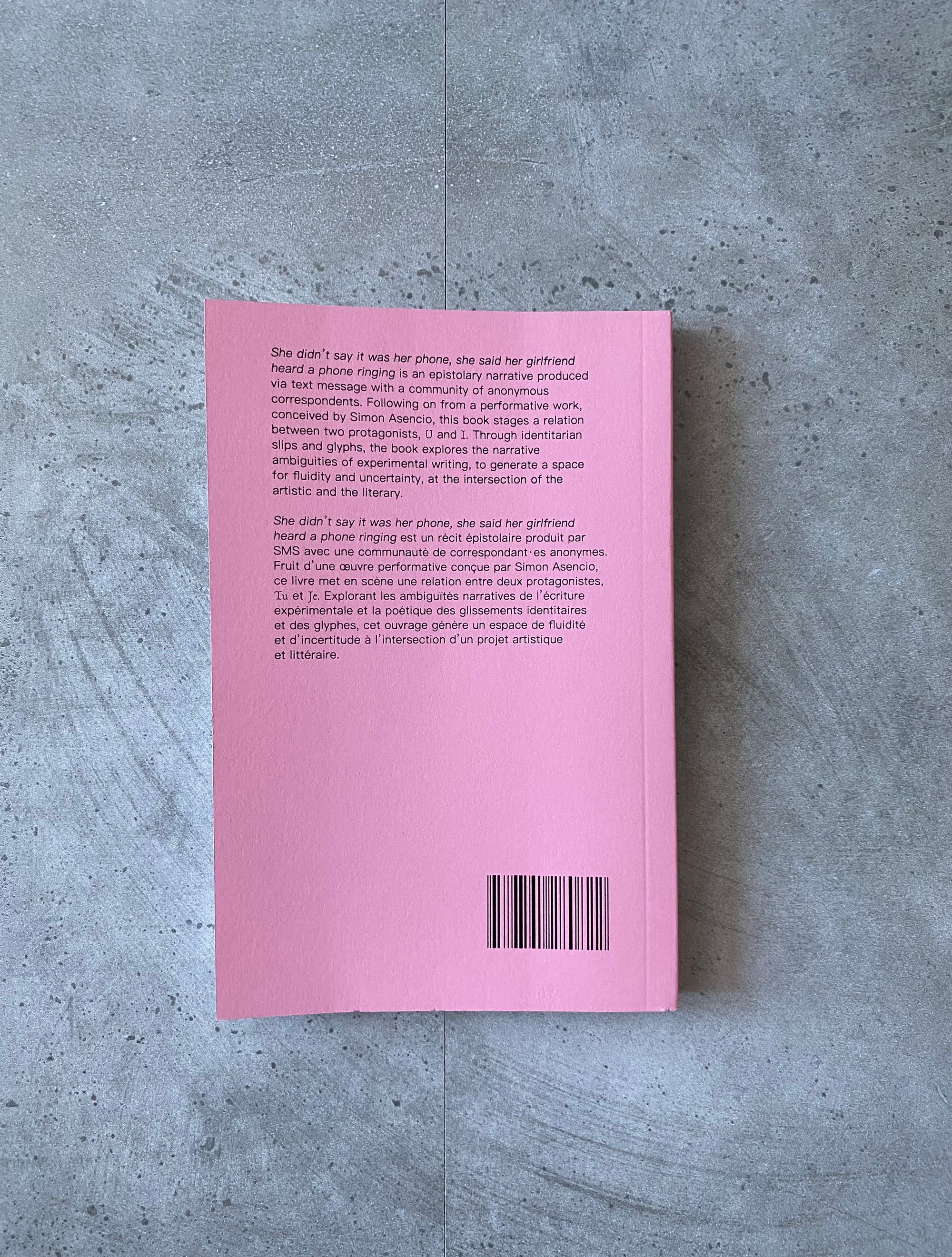 The volume is an epistolary narrative produced via text message with a community of anonymous correspondents. Following on from a performative work, conceived by Simon Asencio, this book stages a relation between two protagonists, U and I. Through identitarian slips and glyphs, the book explores the narrative ambiguities of experimental writing, to generate a space for fluidity and uncertainty, at the intersection of the artistic and the literary.