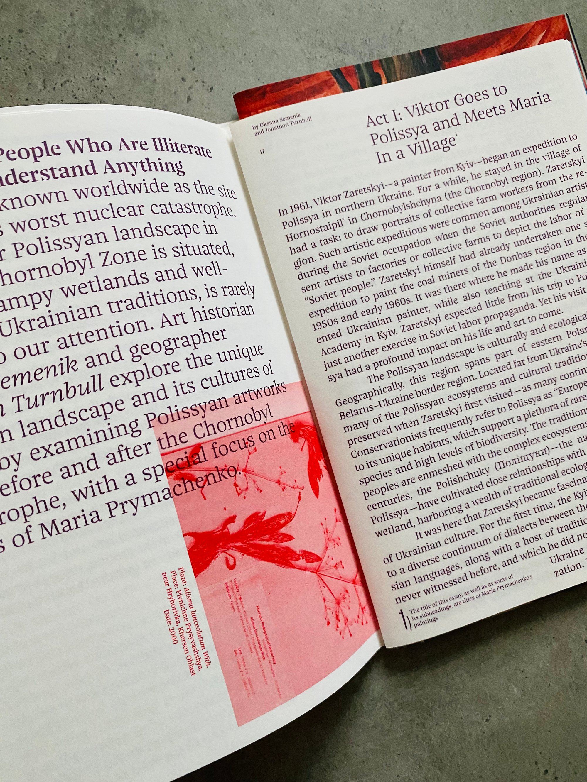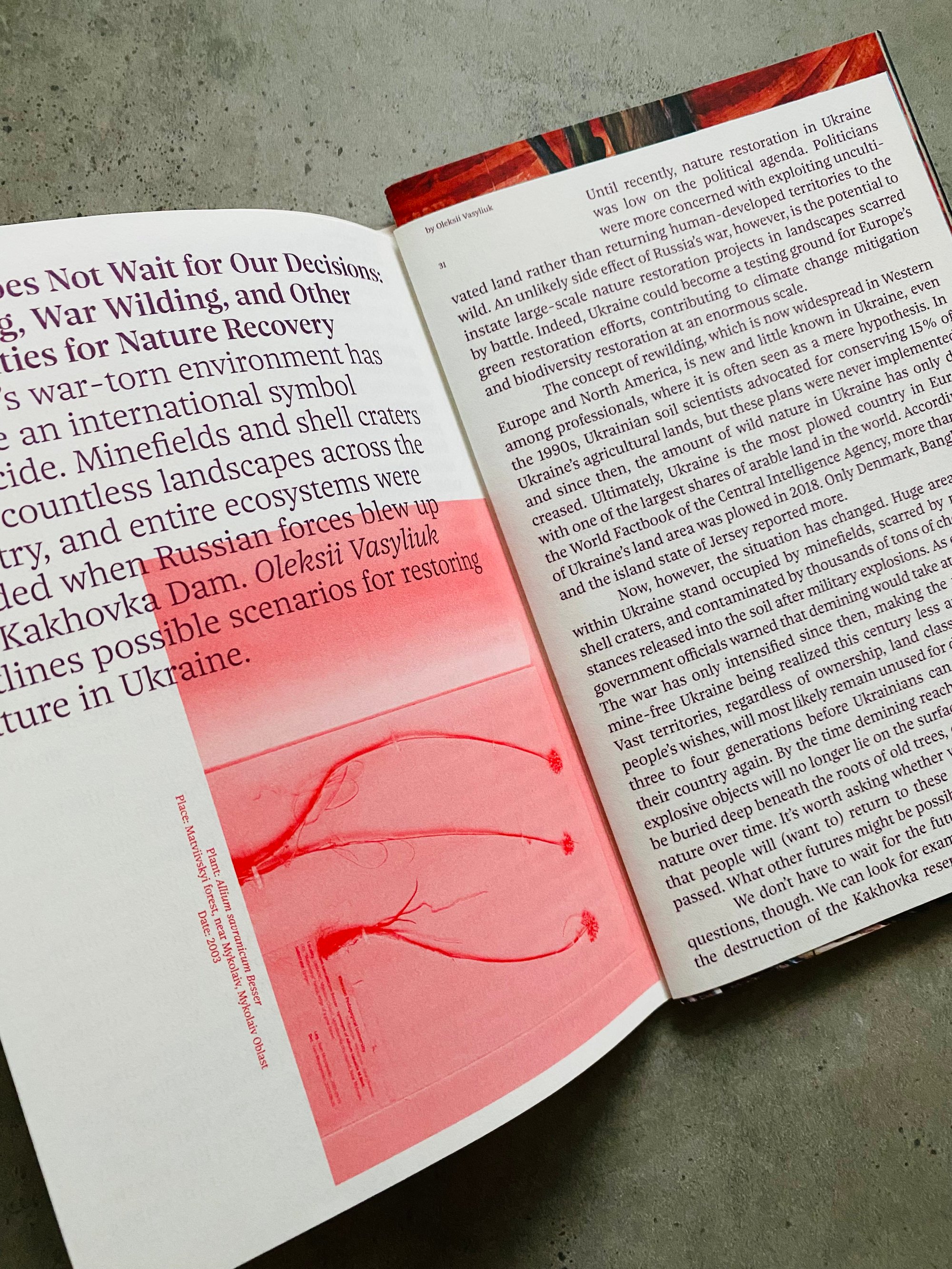 The authors and artists embark on a journey through various regions: from the Chernobyl Exclusion Zone in Polissya to the Kakhovka Dam in the Kherson region to the humid, vibrant ecosystems around Odesa and the agricultural landscapes of Luhansk and Kropyvnytskyi. Shrinking rivers, scientific collections in exile, traditional ecological knowledge, the effects of the nuclear disaster and the consequences of agricultural exploitation are just some of the topics covered in this issue.