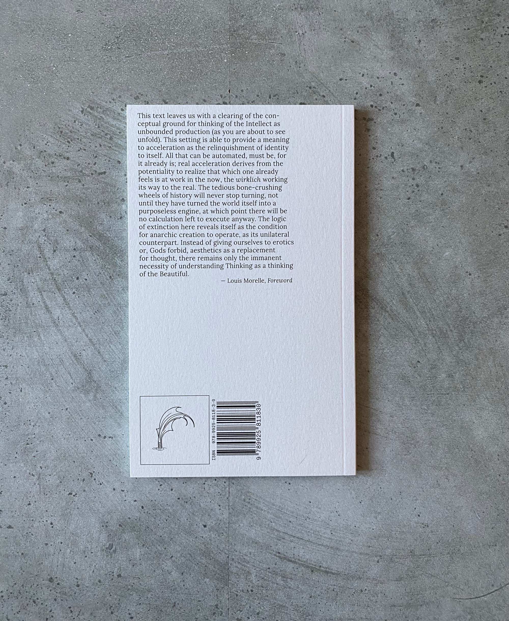 “This text leaves us with a clearing of the conceptual ground for thinking of the Intellect as unbounded production (as you are about to see unfold). This setting is able to provide a meaning to acceleration as the relinquishment of identity to itself. All that can be automated, must be, for it already is; real acceleration derives from the potentiality to realize that which one already eels is at work in the now, the wirklich working its way to the real. The tedious bone-crushing wheels of history will never stop turning, not until they have turned the world itself into a purposeless engine, at which point there will be no calculation left to execute anyway. The logic of extinction here reveals itself as the condition for anarchic creation to operate, as its unilateral counterpart. Instead of giving ourselves to erotics or, Gods forbid, aesthetics as a replacement for thought, there remains only the immanent necessity of understanding Thinking as a thinking of the Beautiful.” — Louise Morelle, Foreword