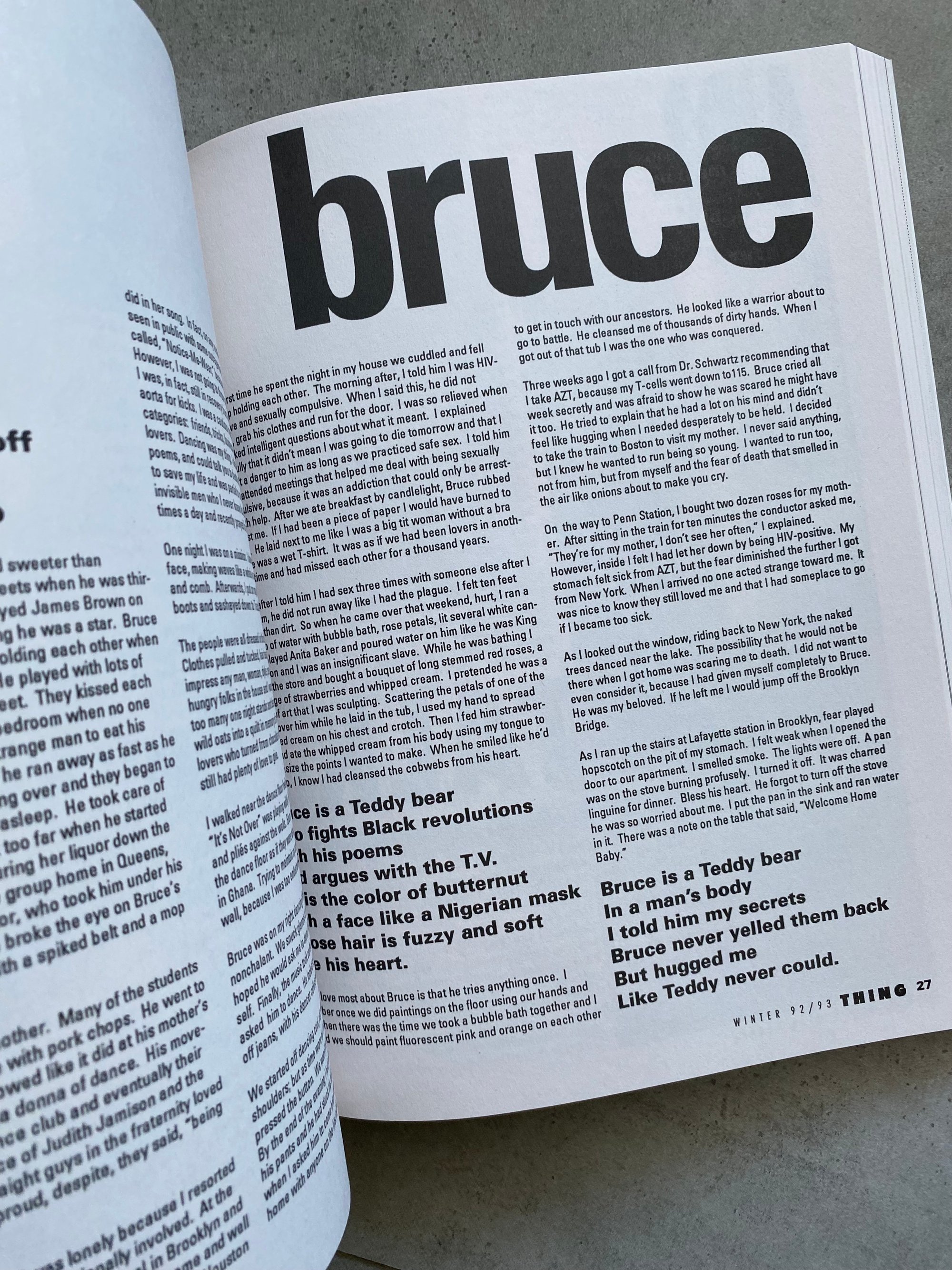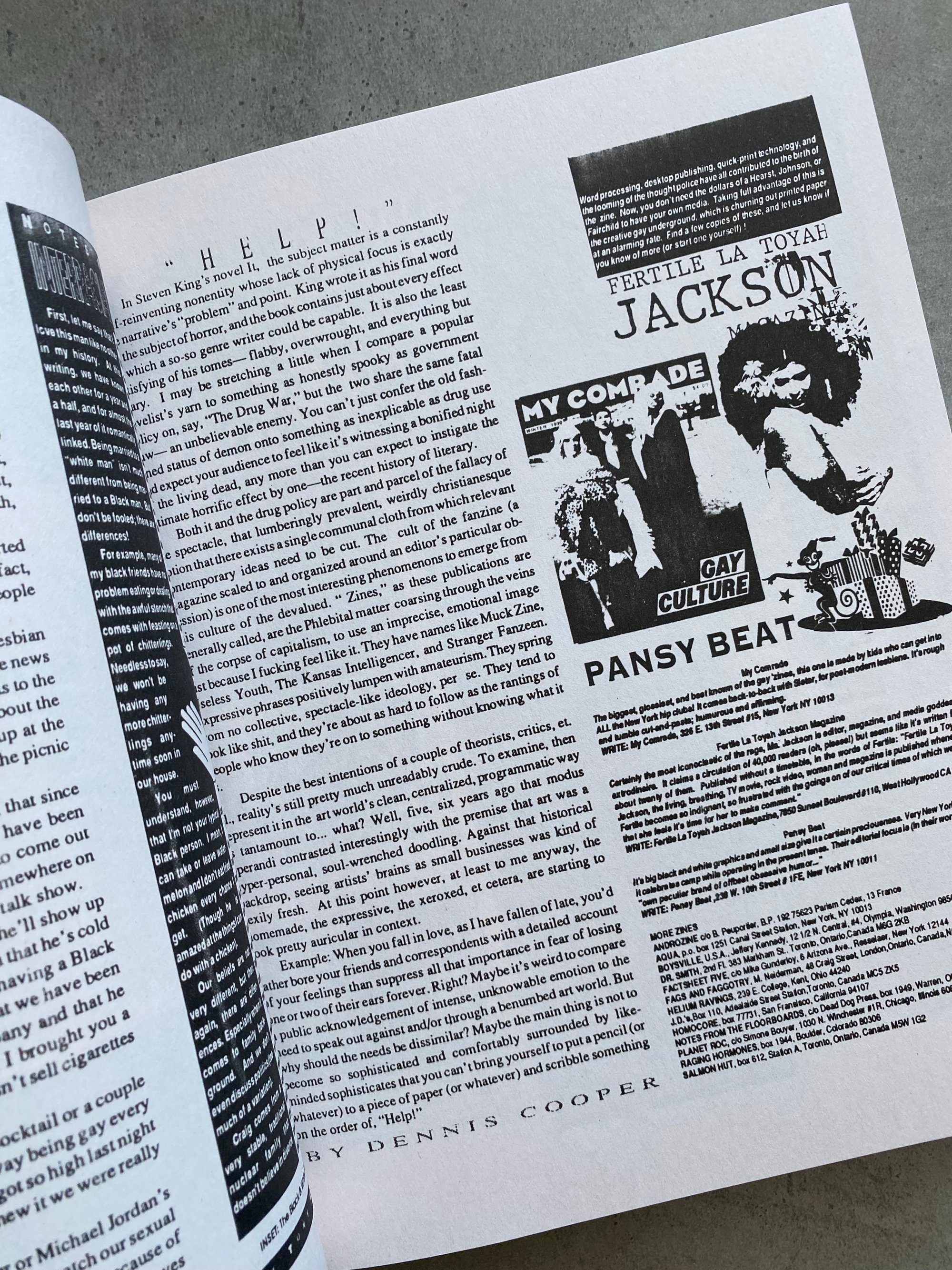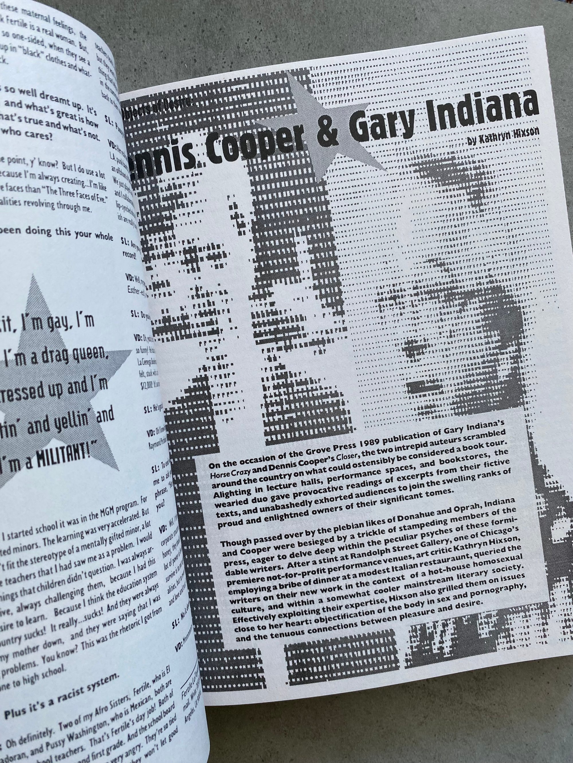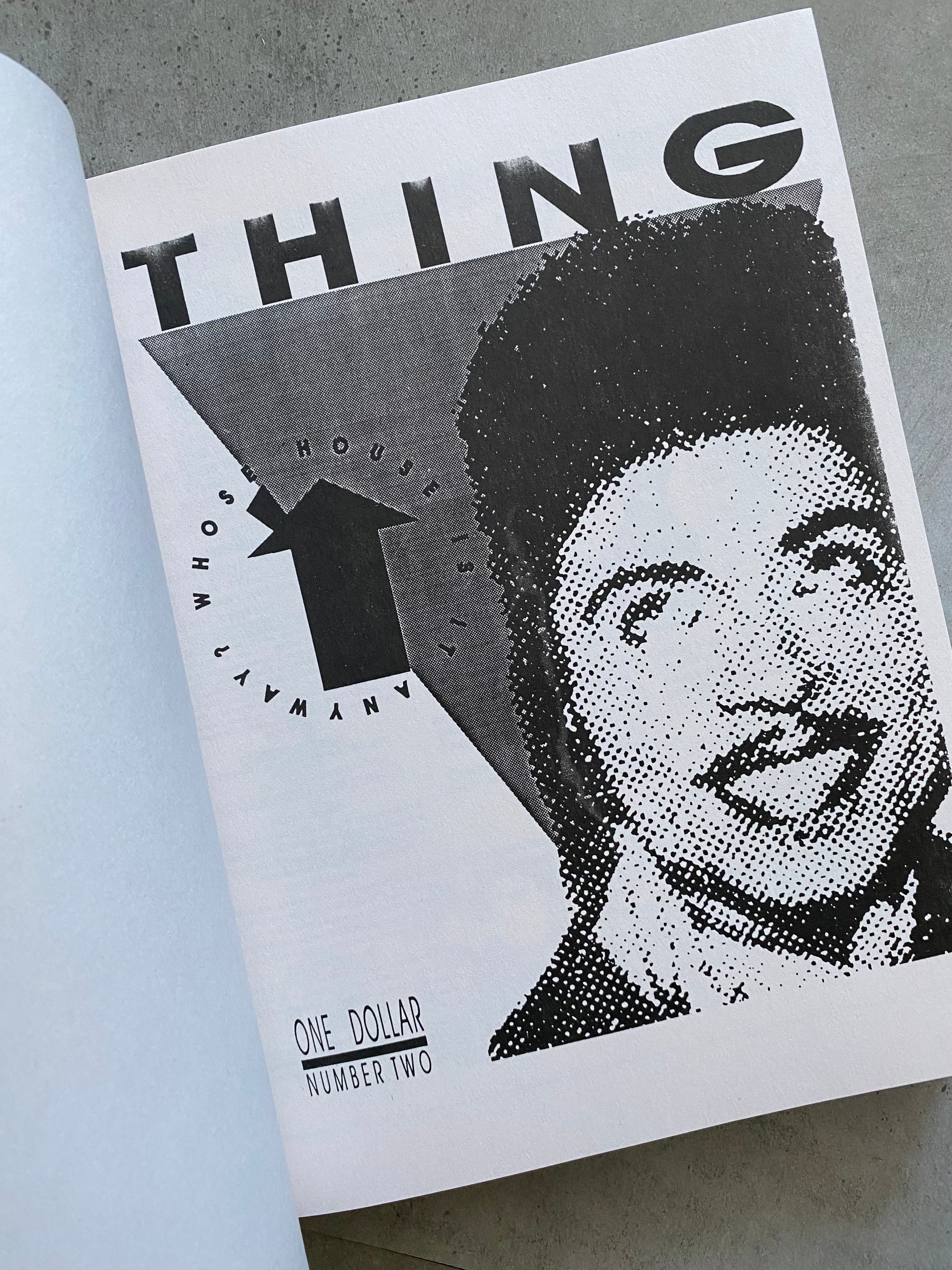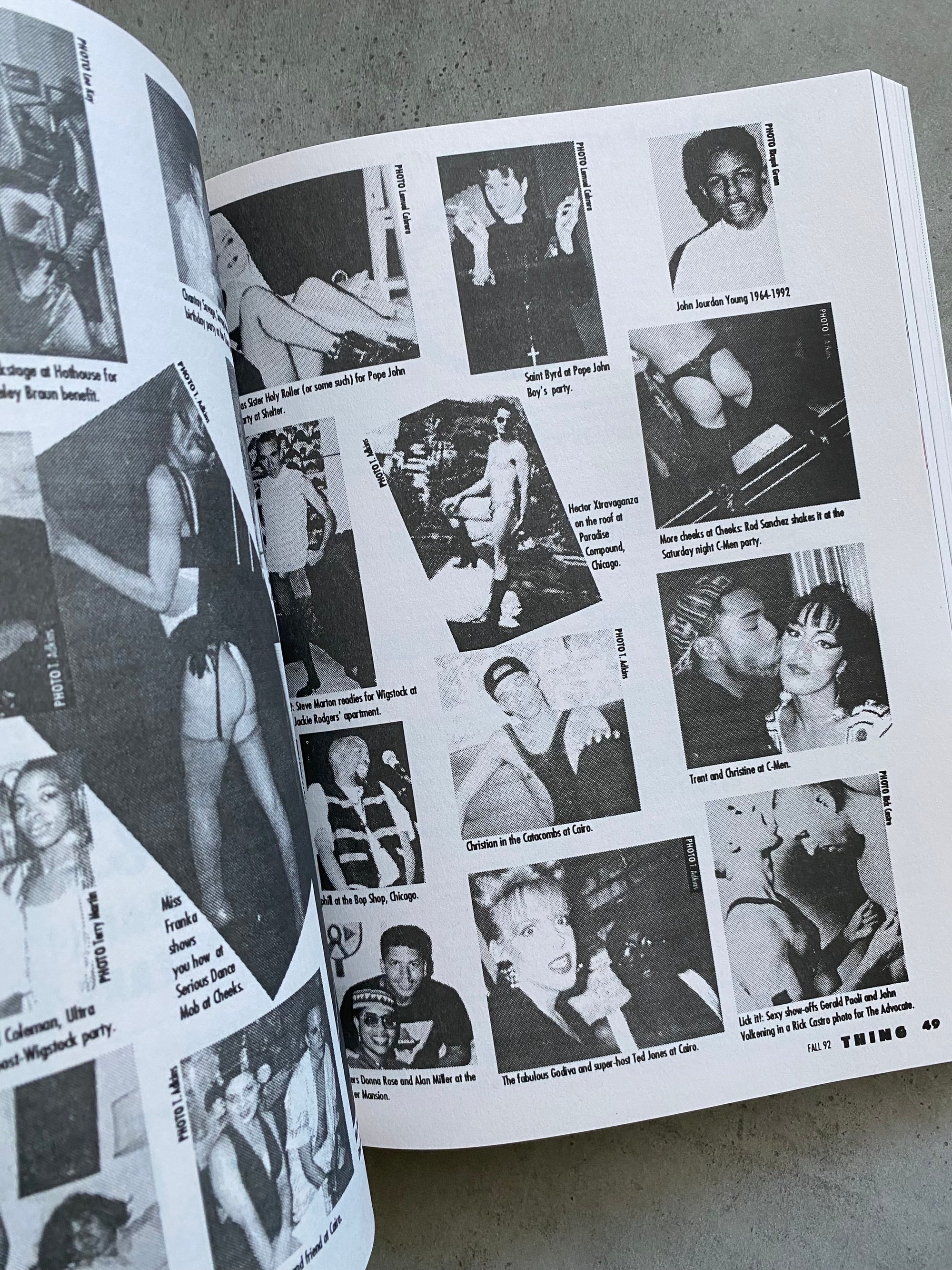 As House music thrived, THING captured the multidisciplinary nature of the scene, opening its pages to a wide range of subjects: poetry and gossip, fiction and art, interviews and polemics. The HIV/AIDS crisis loomed large in its contents, particularly in the personal reflections and vital treatment resources that it published. An essay by poet Essex Hemphill was published alongside the gossip columnist Michael Musto and Rupaul dished wisdom alongside a diary from the March on Washington for Lesbian, Gay, and Bi Equal Rights and Liberation. Joan Jett Blakk’s revolutionary presidential campaign is contained in these pages, as are some of the most underground, influential literary voices of the time, such as Dennis Cooper, Vaginal Davis, Gary Indiana, Marlon Riggs, David Wojnarowicz, and even David Sedaris.