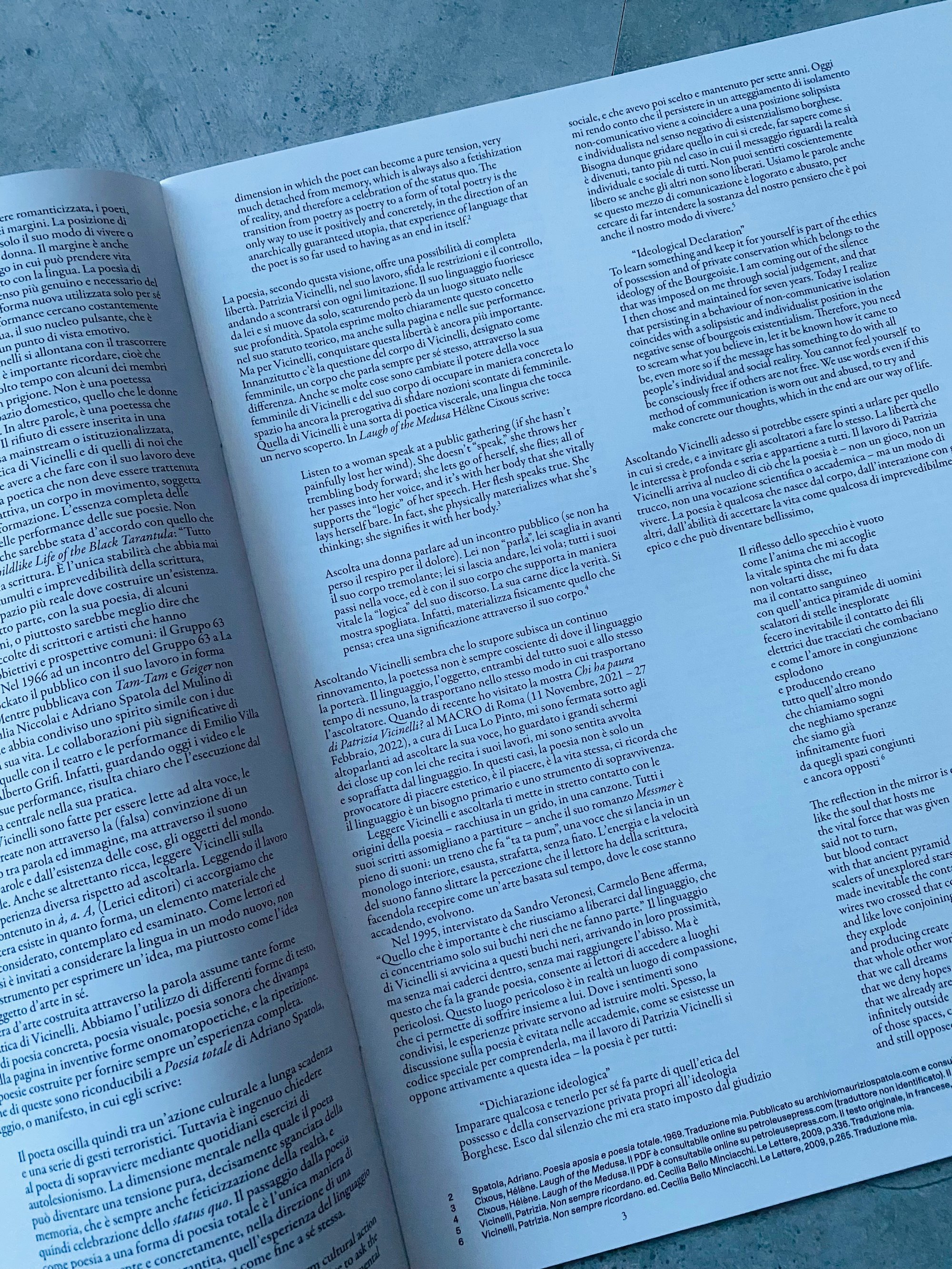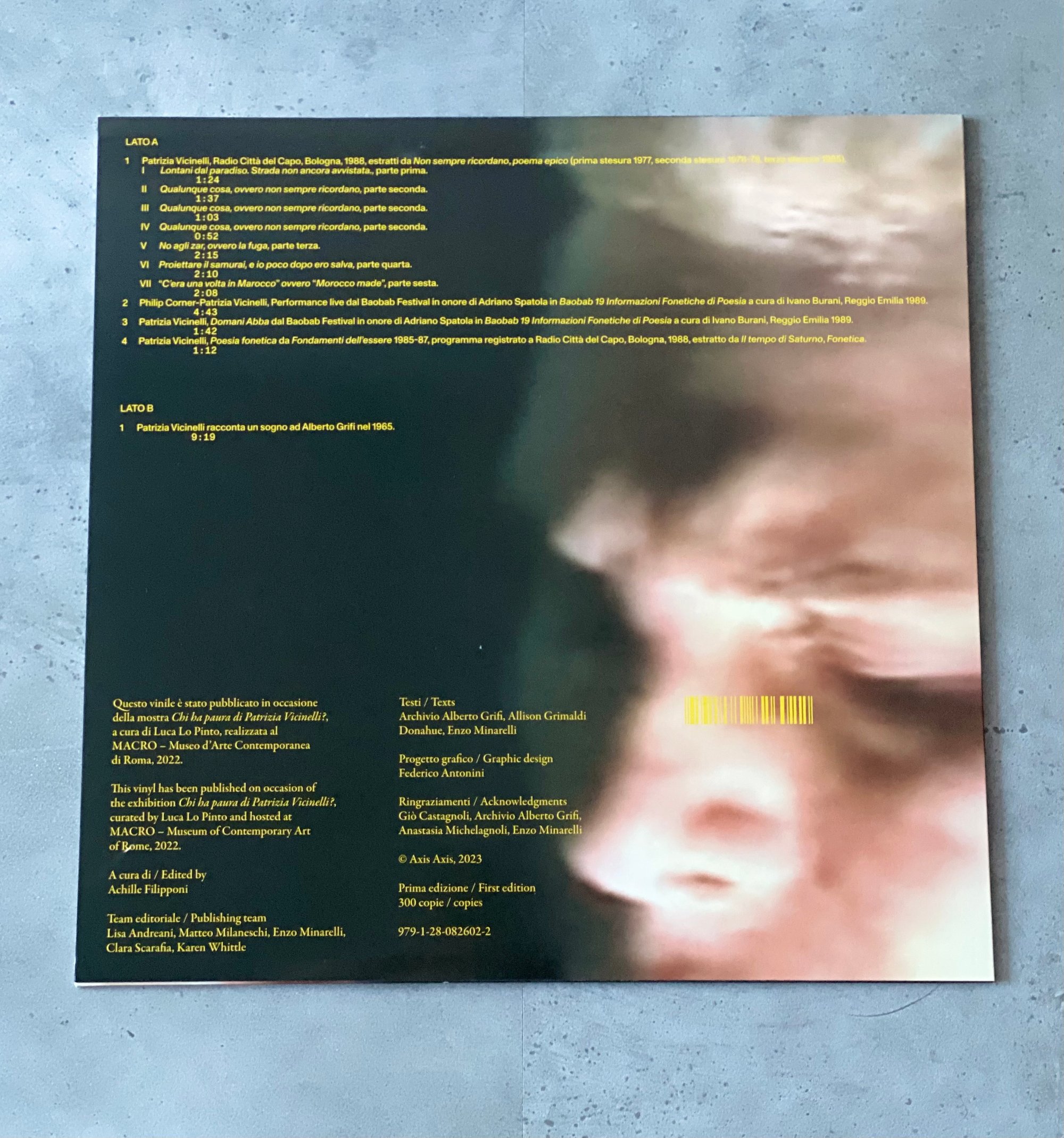 Axis Axis continues its focus on the relationship between orality and poetry with this monographic edition that offers an overview on the incredible personality of this pivotal figure from the Italian neo-avant-garde poetry scene. The 12" vinyl contains several unpublished audio performances and a B side with an unpublished moving audio-recording by Alberto Grifi of Vicinelli who tells him a dream, in drowsiness. Throughout the vinyl Vicinelli’s voice follows her provocative, deconstructed, phonetic and polyglot writing, as a founding tool of her expressionistic dynamism capable of underscoring the historic changes that took place across the years of the poet’s short lifetime. The edition is curated by Achille Filipponi and contains also a twelve pages stapled glossy booklet with essays by Allison Grimaldi Donahue, Enzo Minarelli and a text by Archivio Alberto Grifi.
